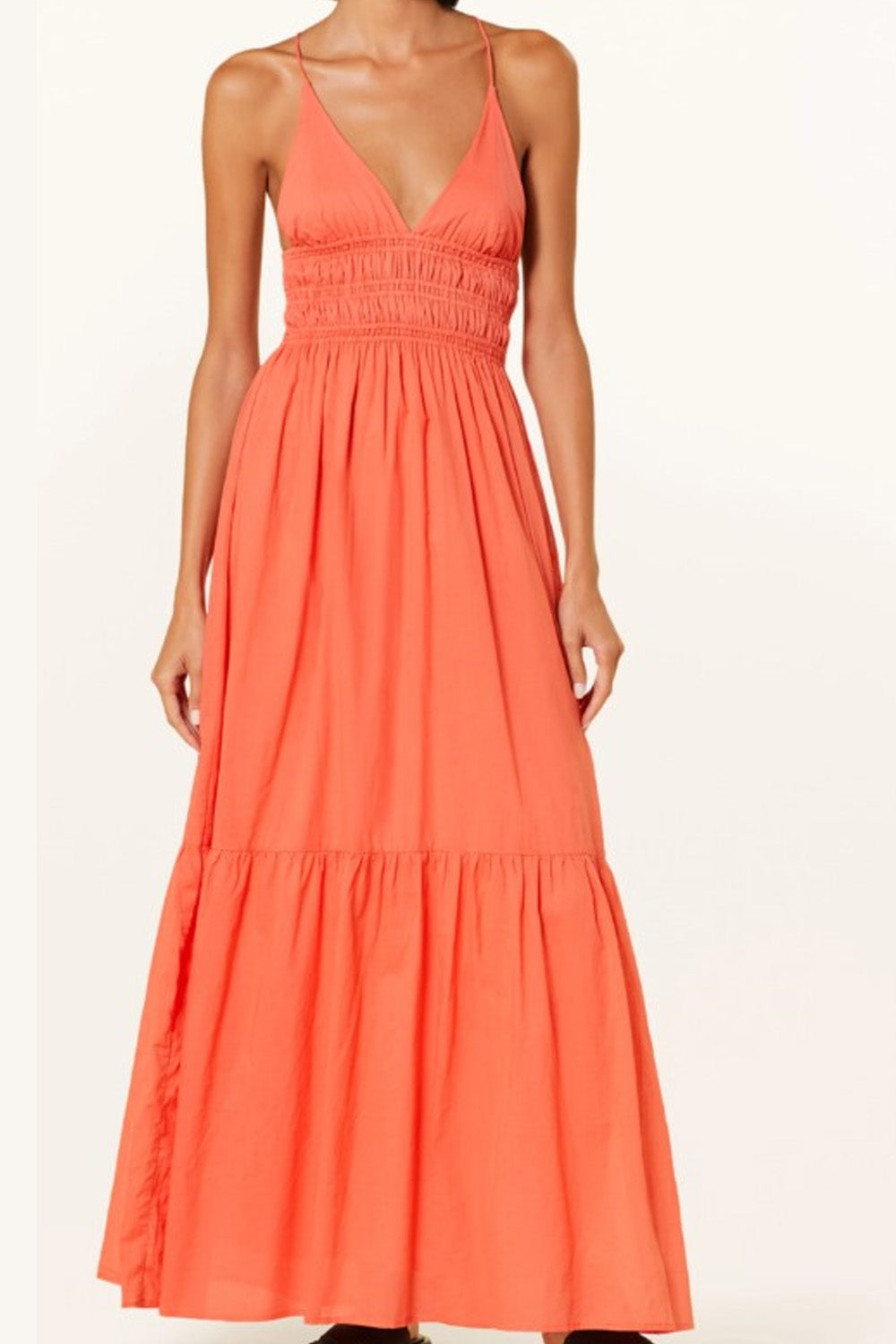 Type-Majesty Orange Dress, Color-Orange, Neck type-Deep V neck, Sleeve Length-Sleeveless, Fit-Regular, Fabric-Poplin
