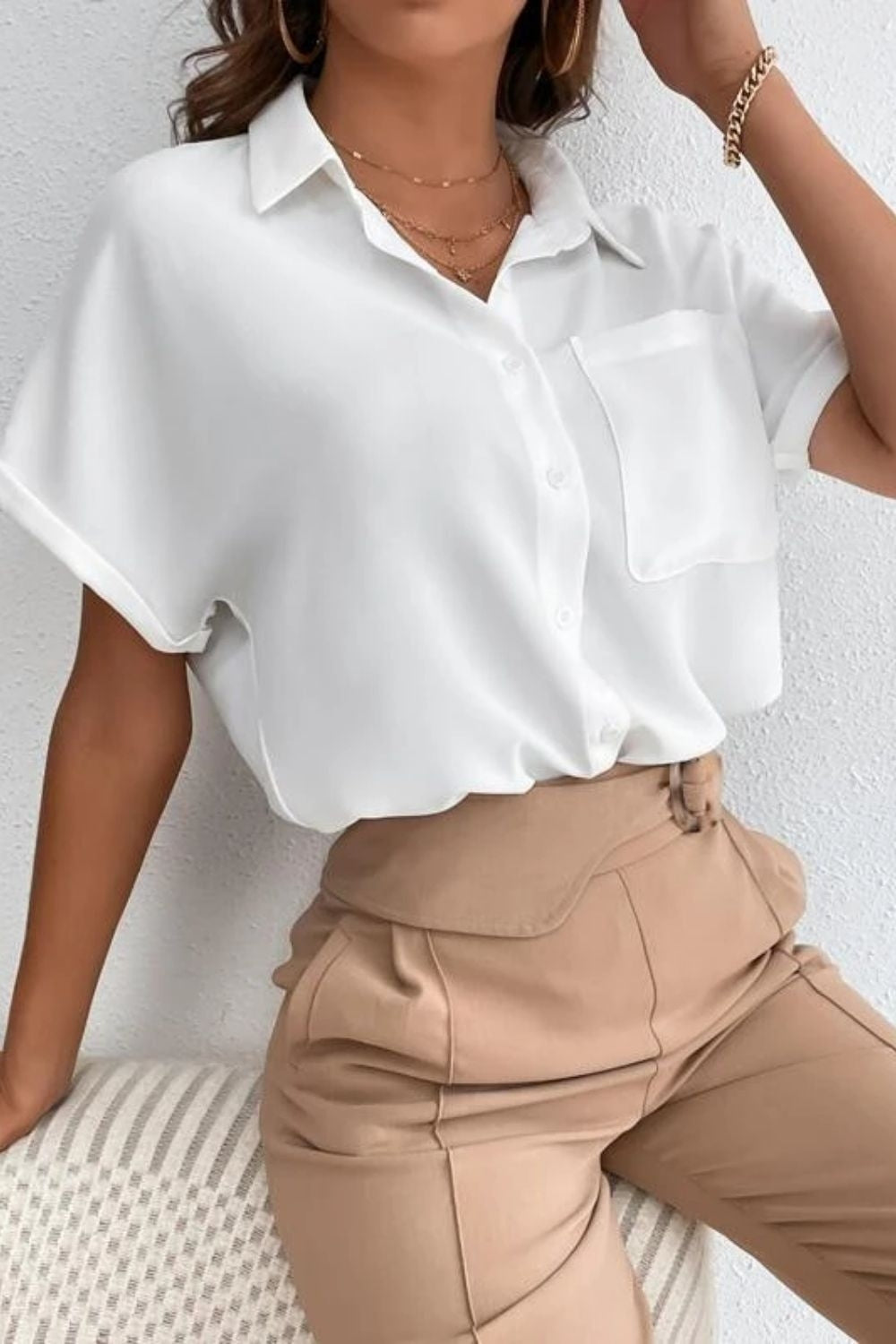 Office Elegance: Tuck the top into high-waisted trousers or a pencil skirt for a sophisticated office look. Complement the outfit with pointed-toe flats or heels and minimal jewelry for a professional touch.