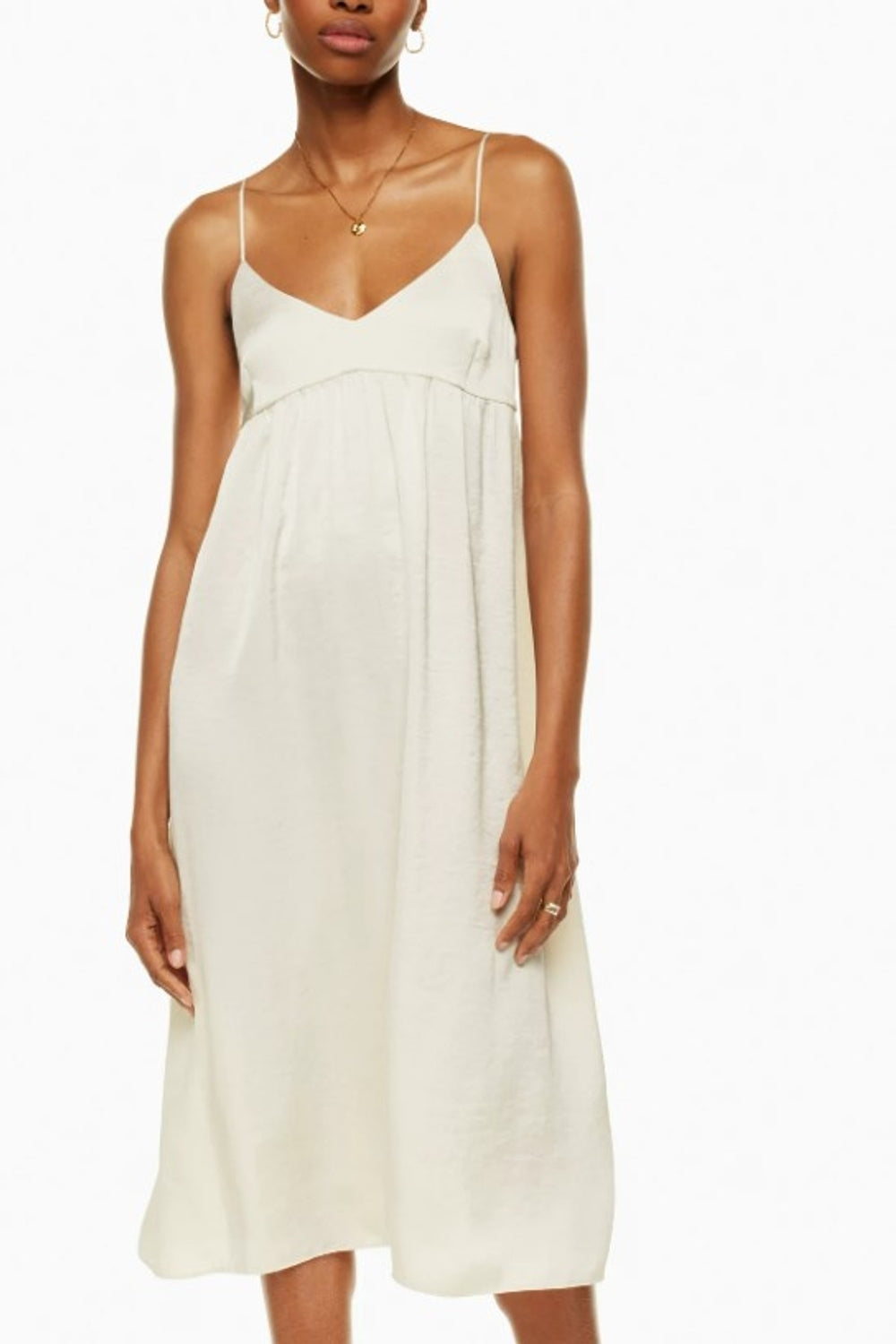 Type - Merry White Dress, Color - White, Neck type - V Neckline, Sleeve Length - Sleeveless, Fit - Regular, Fabric - Satin