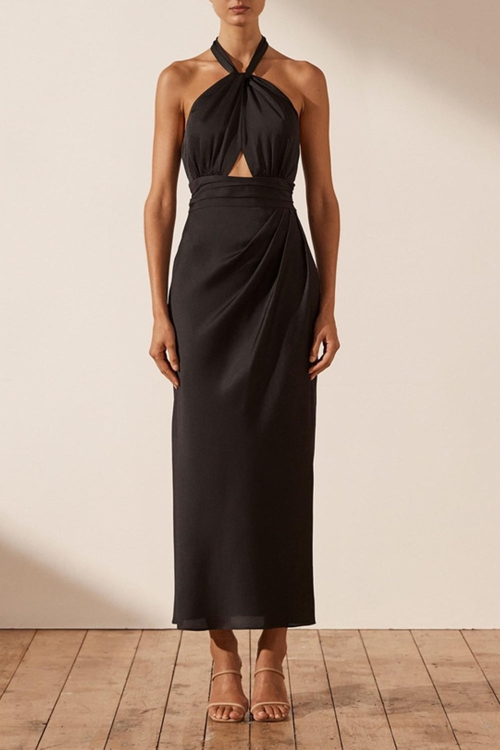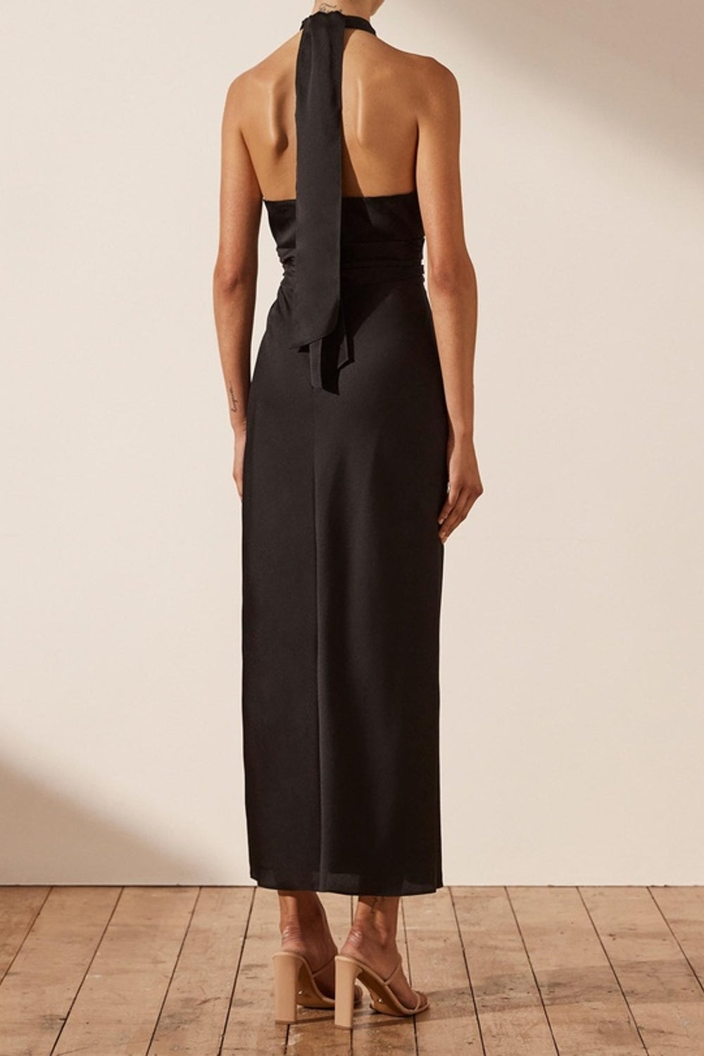 Elevate your wardrobe with our exquisite Miryang Black Dress, a timeless piece that exudes sophistication and allure. Crafted from luxurious satin lycra fabric, this dress promises a sleek silhouette and unparalleled comfort. The high halter neck design adds a touch of elegance, while the sleeveless style accentuates your shoulders and arms. With its body-hugging fit, this black bodycon dress effortlessly flatters your curves, making it a must-have for every woman's closet. Whether you're attending a cocktail party or a special event, this versatile dress ensures you make a striking statement wherever you go. Shop our Miryang Black Dress online now and embrace the epitome of chic refinement.