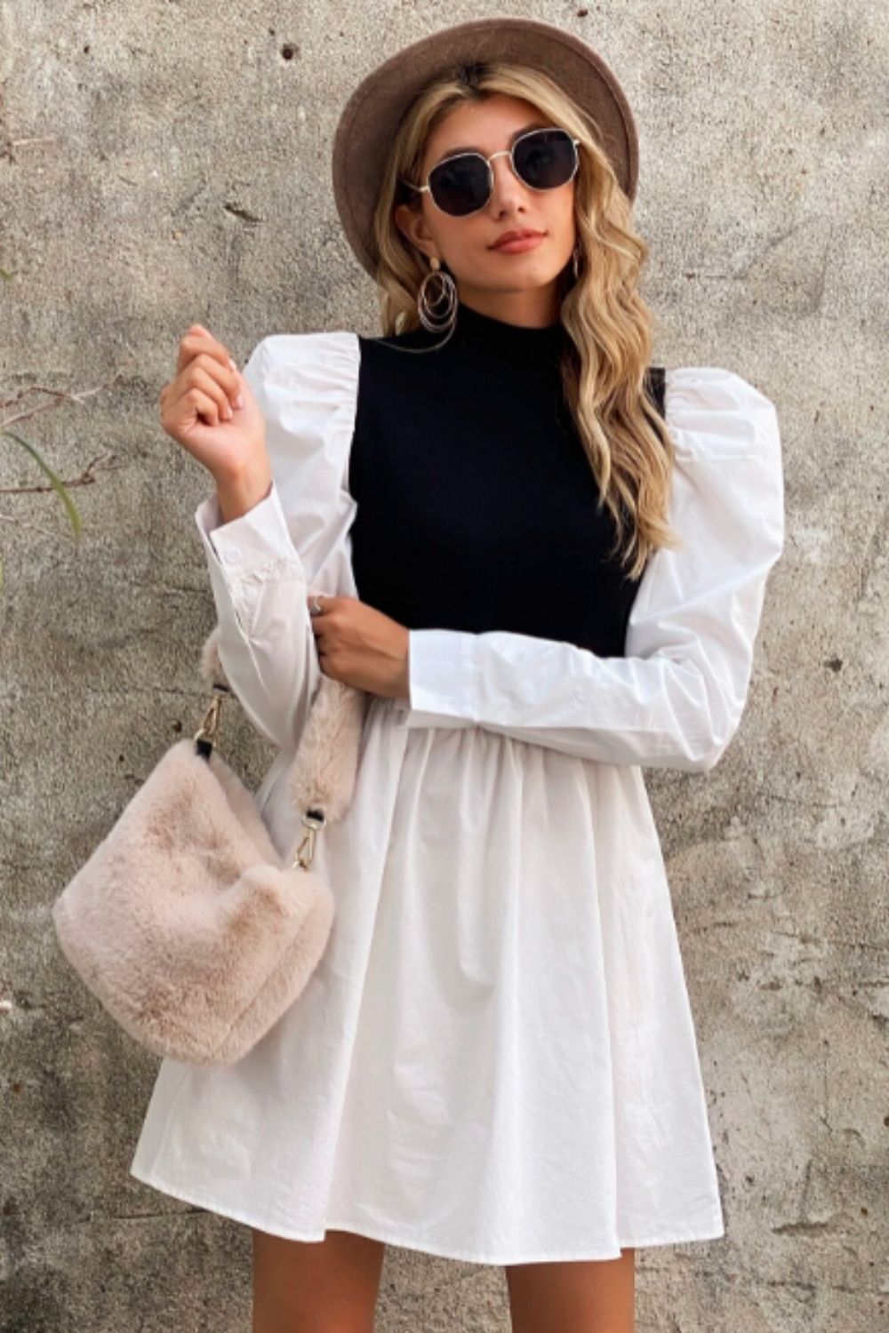 - Type: Mock Neck Puff Sleeve Color Block Dress