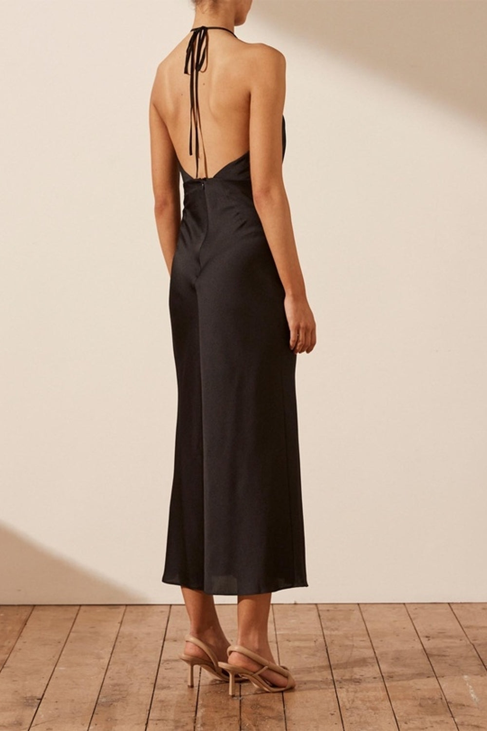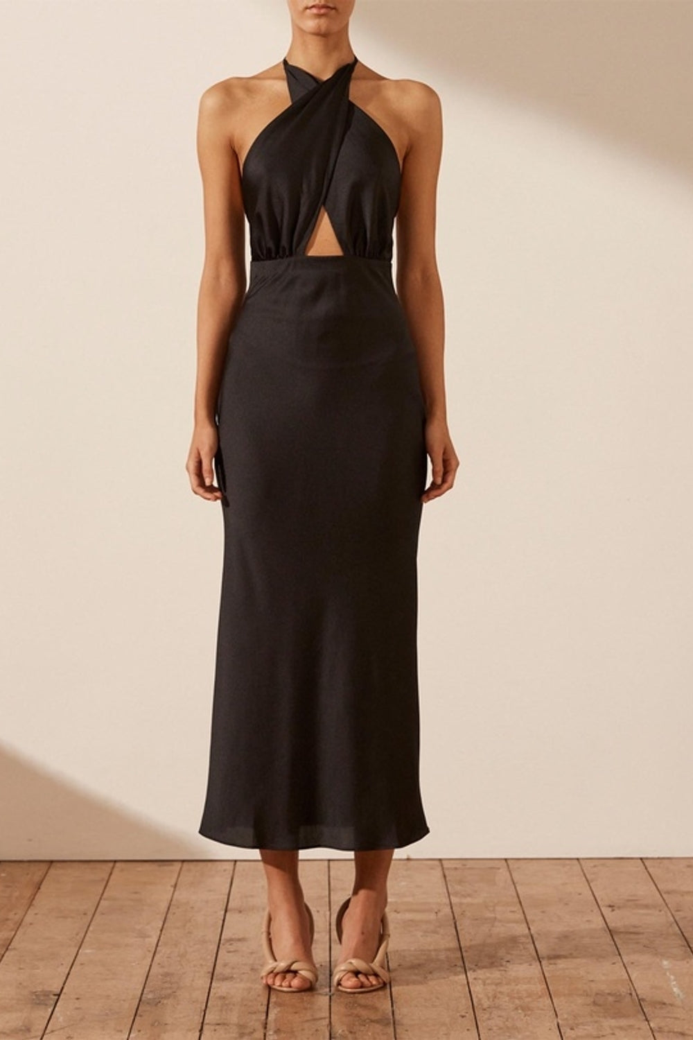 The crossover halter neck adds a touch of sophistication, drawing attention to your shoulders and collarbones, while the sleeveless design provides versatility for layering or accessorizing. Whether you're attending a cocktail party, a dinner date, or a special event, the Naju Black Dress promises to make a statement with its understated glamour and classic black hue.