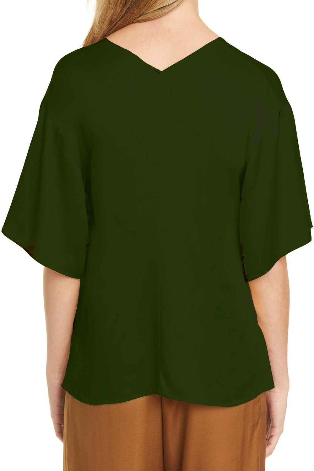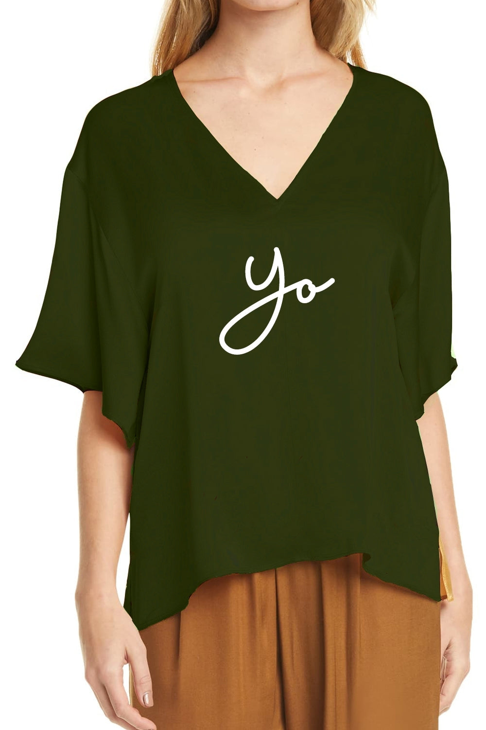 A simple top made from satin with a V-neckline for both the front and back and a semi flared half sleeves. A text print is placed at the front.