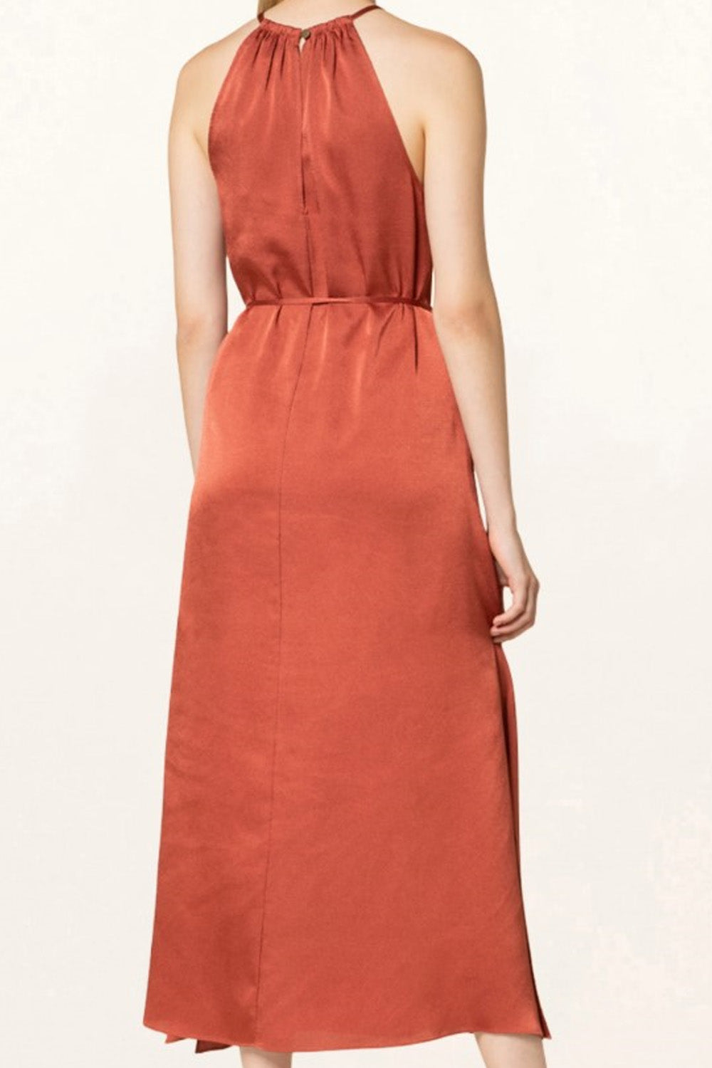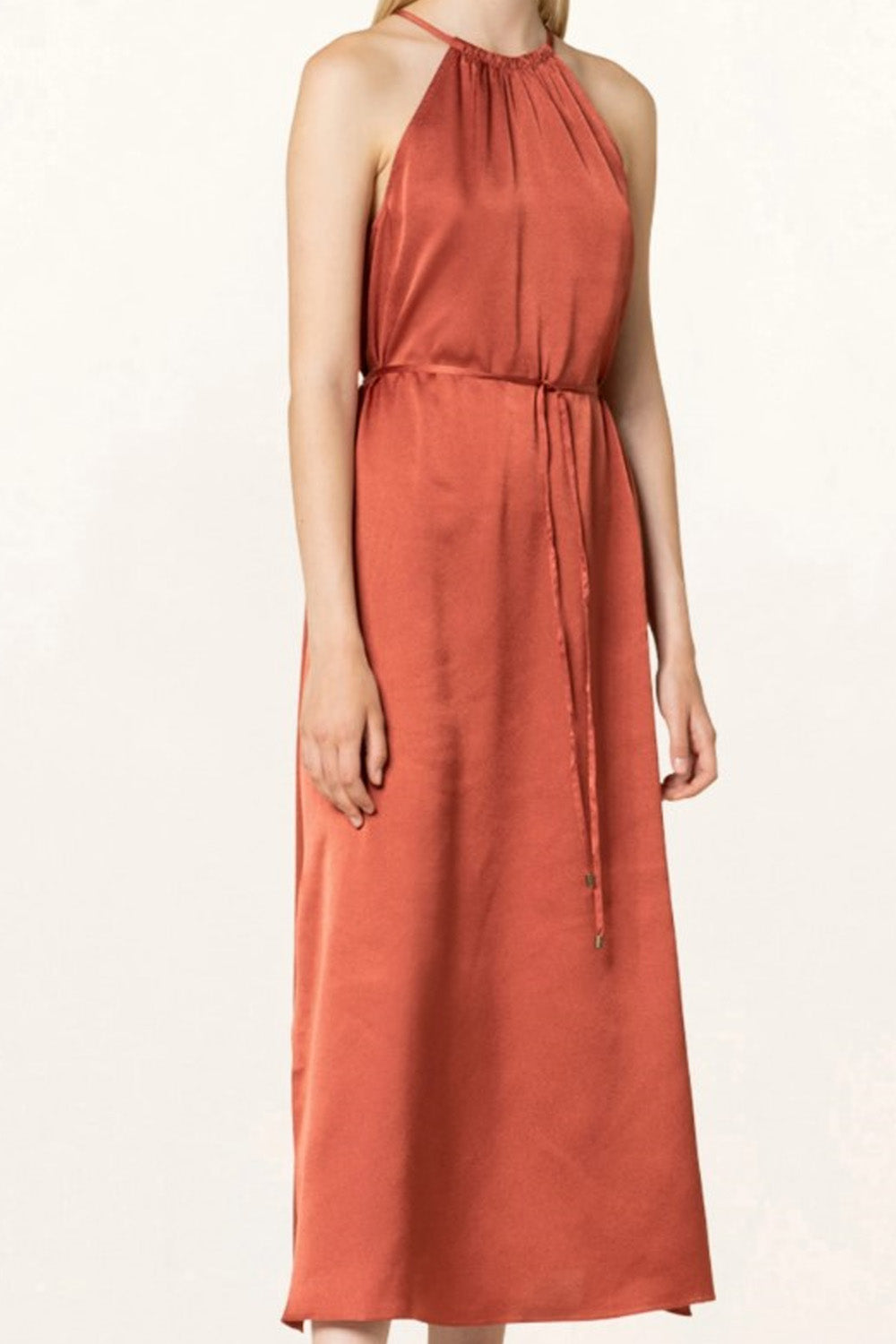 Type-Natural Orange Dress, Color-Orange, Neck type-Halter neck, Sleeve Length-Sleeveless, Fit-Regular, Fabric-Satin Lycra