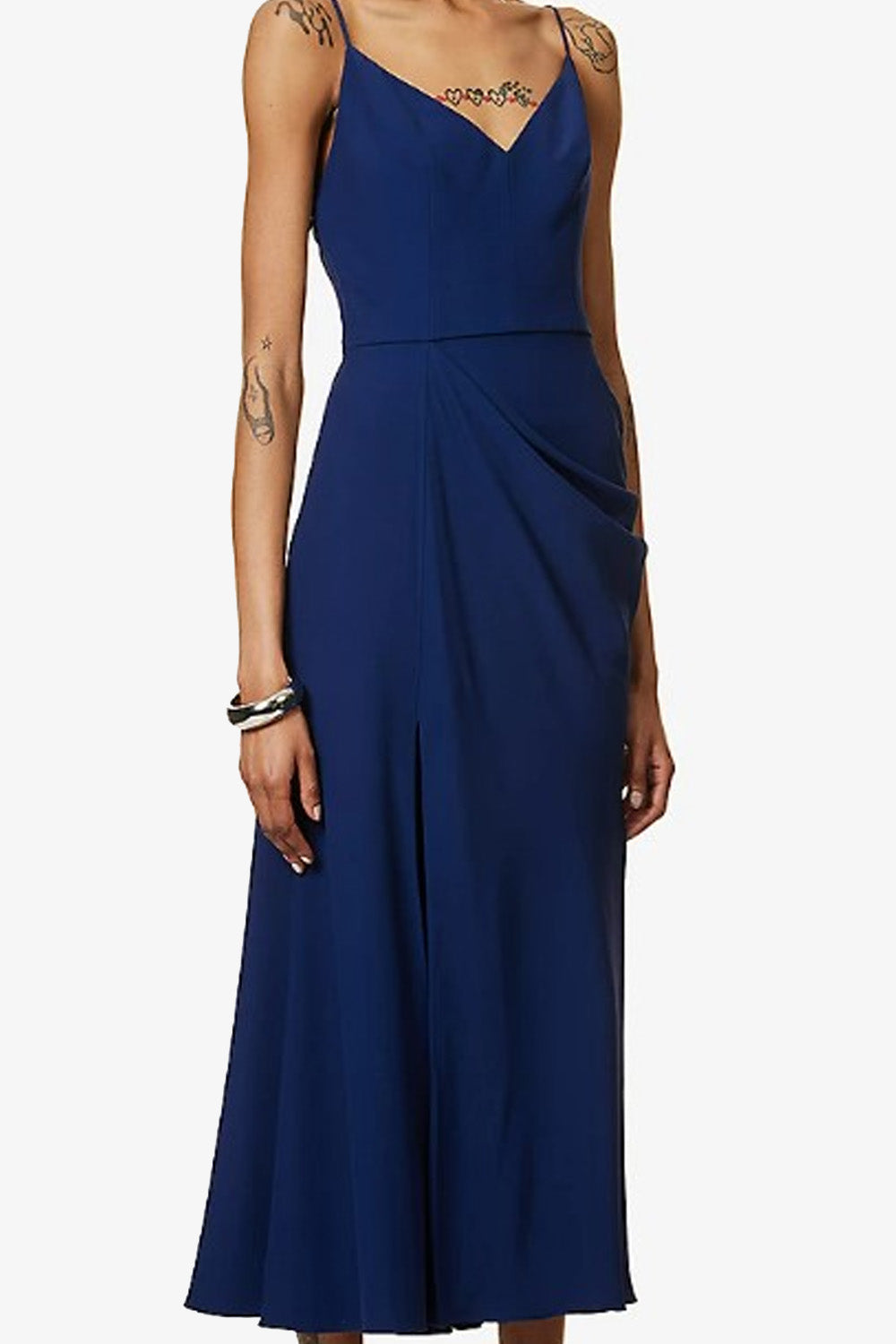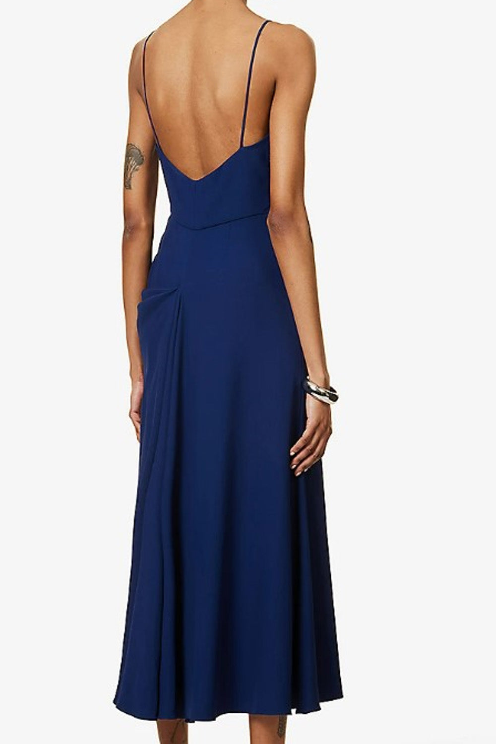 Type-Nebula navy Dress, Color-navy, Neck type-V Neckline, Sleeve Length-Sleeveless, Fit-Regular, Fabric-Satin
