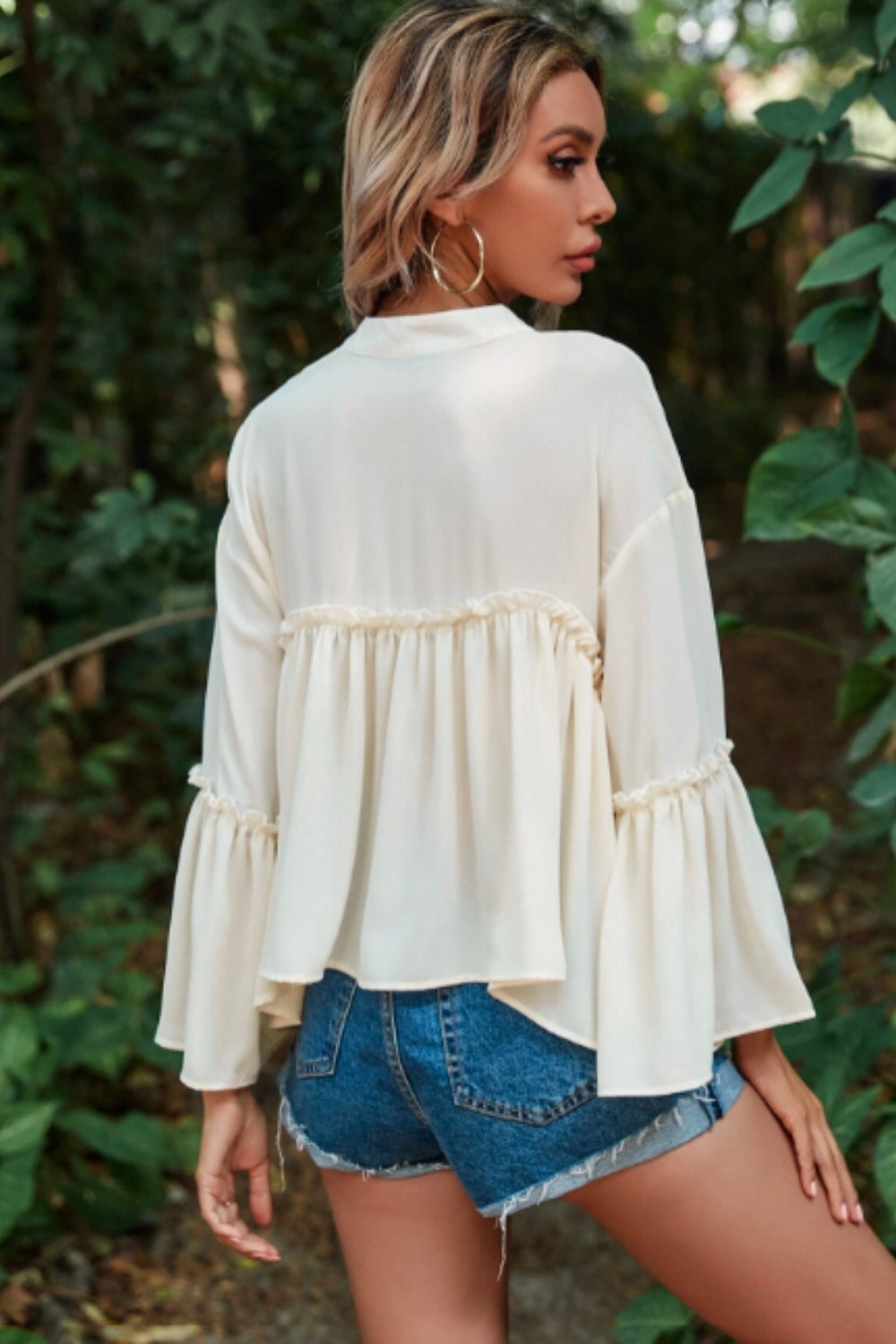 Notch Neck Frill Trim Flounce Sleeve Babydoll Blouse