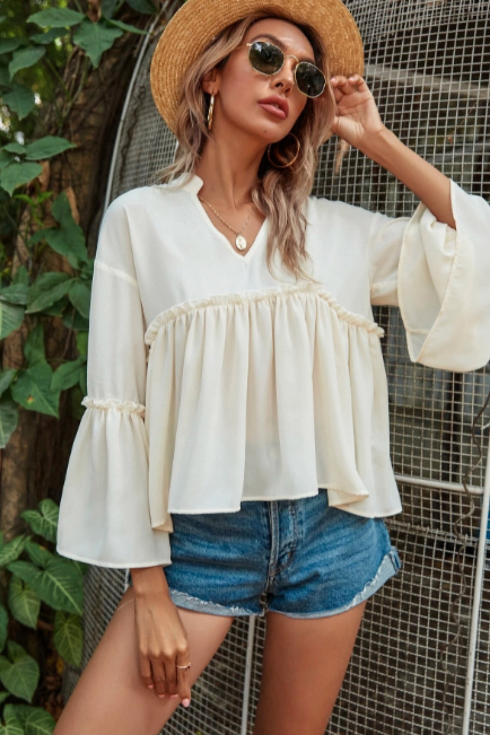 Type: Notch Neck Frill Trim Flounce Sleeve Babydoll Blouse