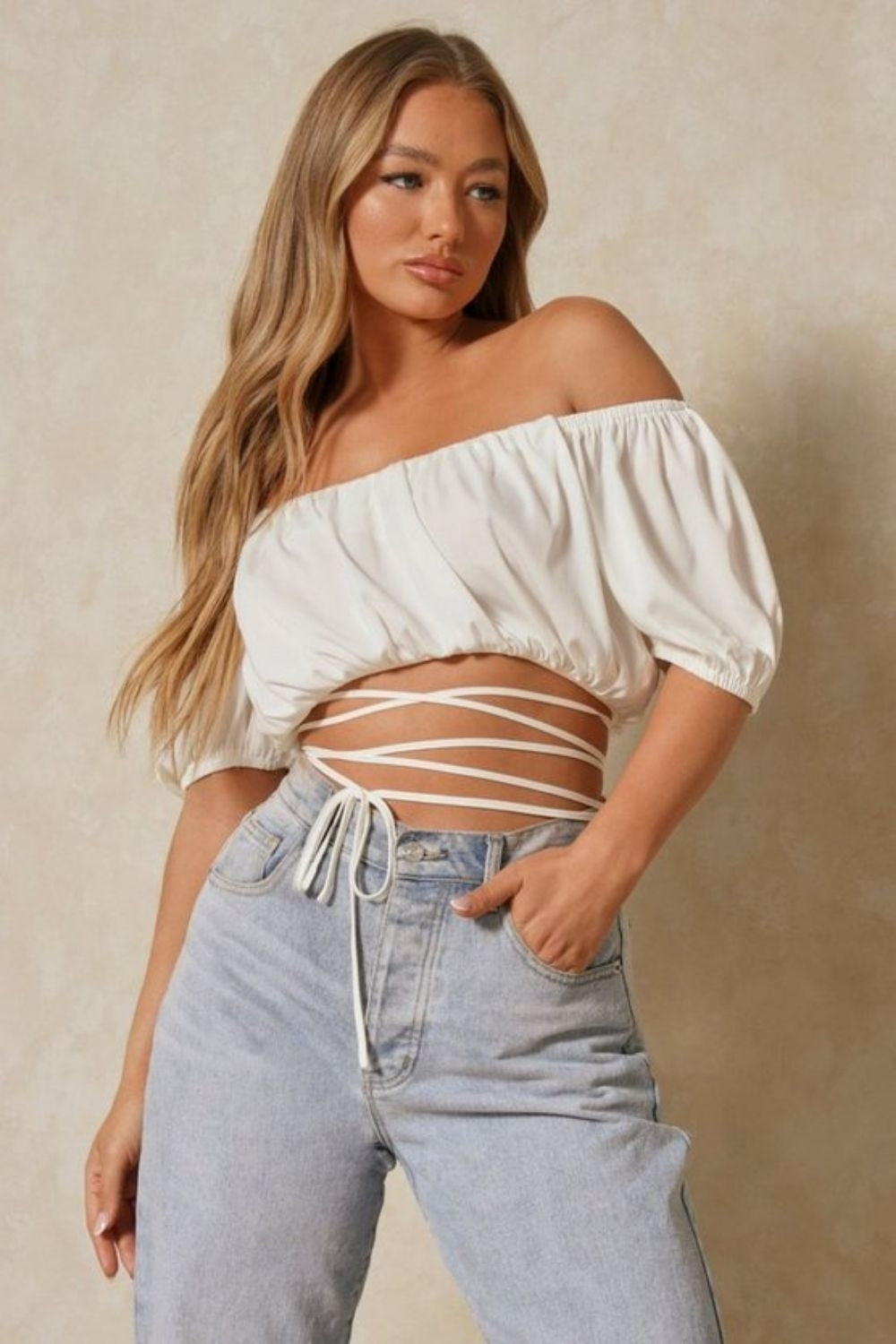 Off Shoulder Tie Knot Detail At Waist White Crop Top