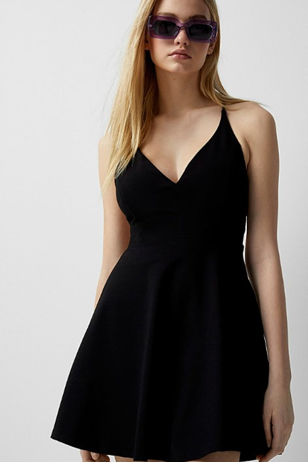 Type-Optimistic Black Dress, Color-Black, Neck type-V Neckline, Sleeve Length-Sleeveless, Fit-Regular, Fabric-Velvet