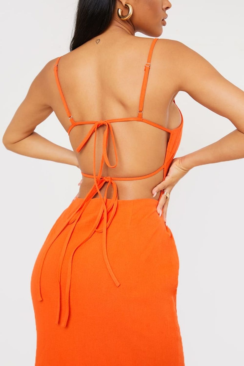 SKU:OrangeSquareNeckSplitSideMaxiDress-XS