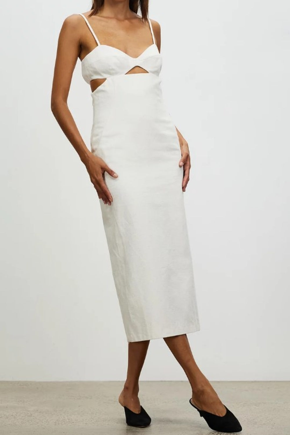 Type-Osan White Dress, Color-White, Neck type-Sweetheart neck, Sleeve Length-Sleeveless, Fit-Body Fit, Fabric-Poplin