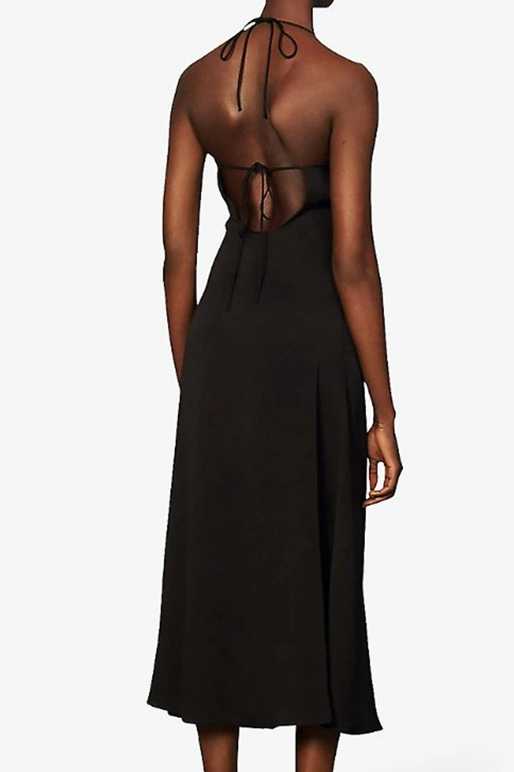 Type-Panache Black Dress, Color-Black, Neck type-V neck, Sleeve Length-Sleeveless, Fit-Regular, Fabric-Satin