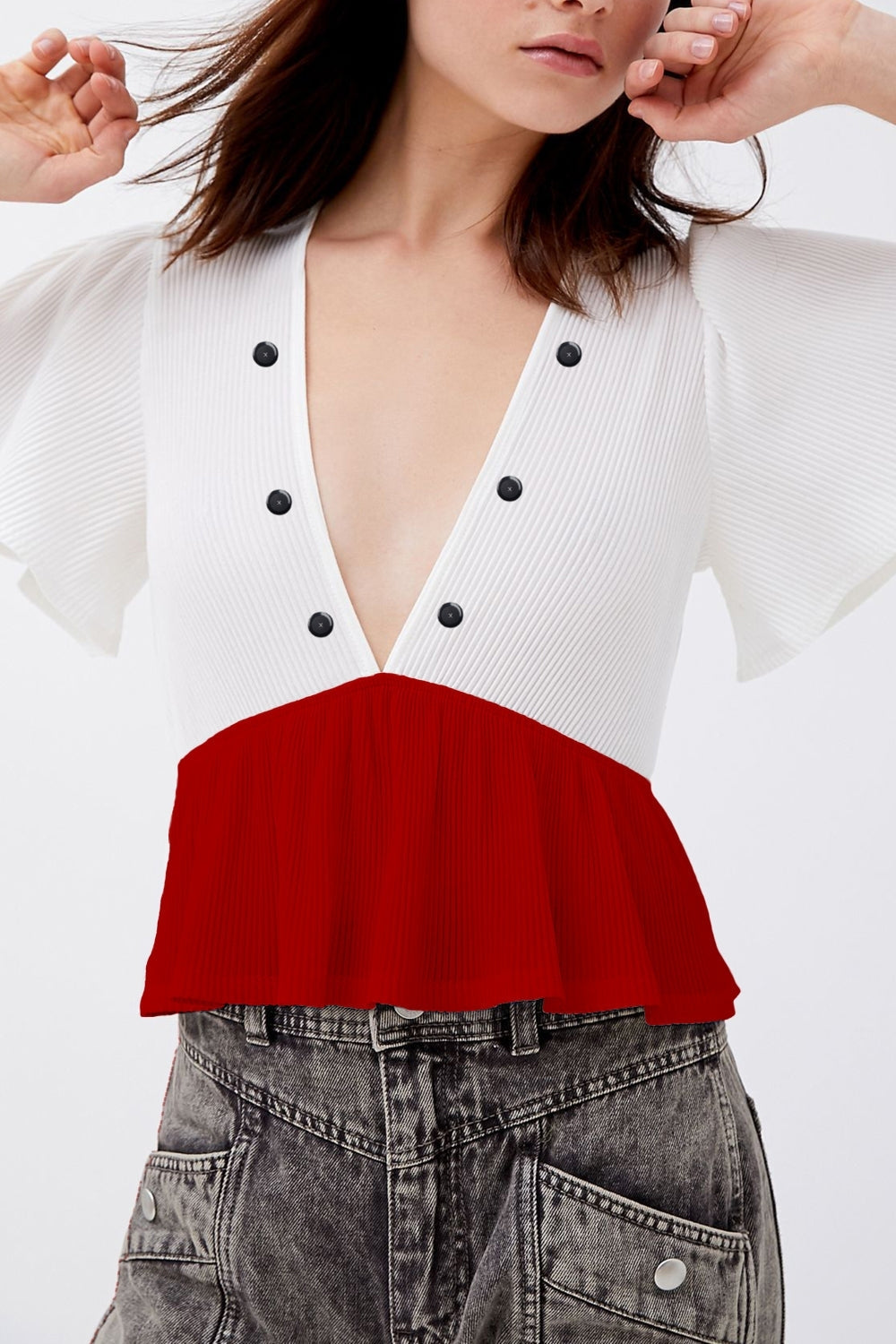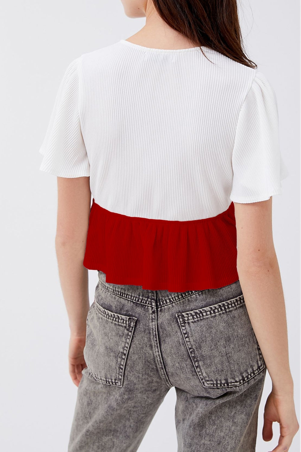This pretty looking peplum top is meant to explore your beautiful ideas with an elegant look. This top has regular fit and half flared sleeve. Made of 100% pure ribbed knit, having design features as peplum, color block are going to add more trendy and unique style to your look.
