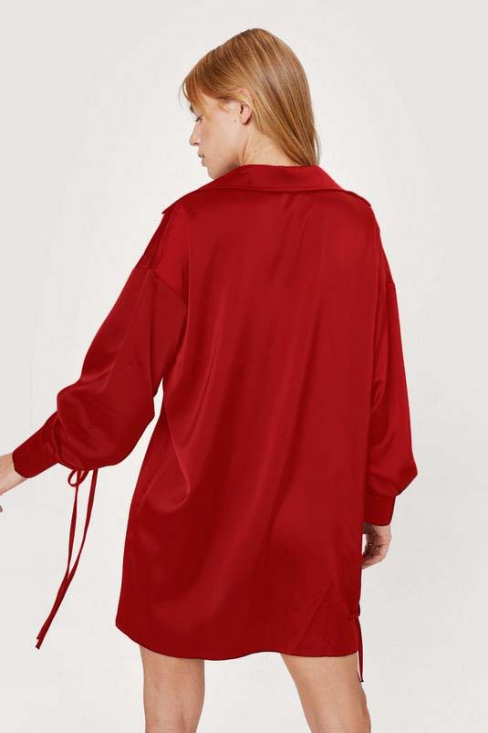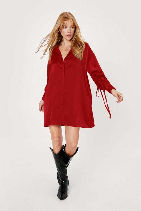 Product Description: Crafted from luxurious satin fabric, this shirt dress drapes beautifully, offering a touch of sophistication to your ensemble. The vibrant red hue adds a bold and playful element, making it an eye-catching choice for any occasion. The V neckline is both flattering and feminine, while the full sleeves with ruched detailing bring a touch of modern chic to the classic shirt dress silhouette.