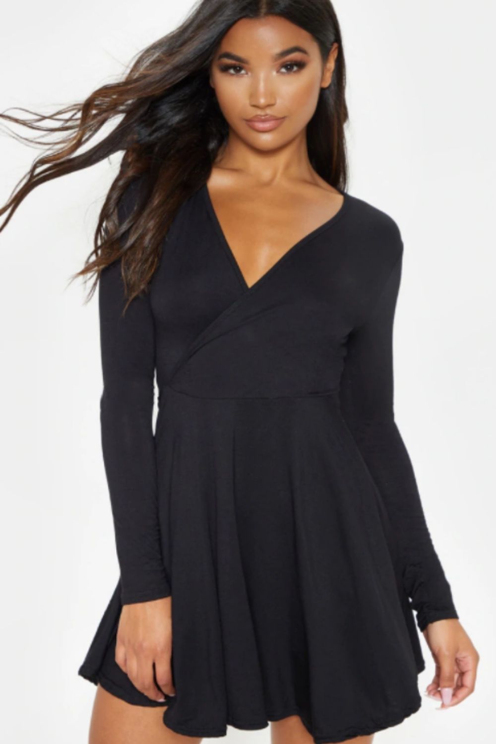 Type-Plunge Neck Mini Black Flare Dress