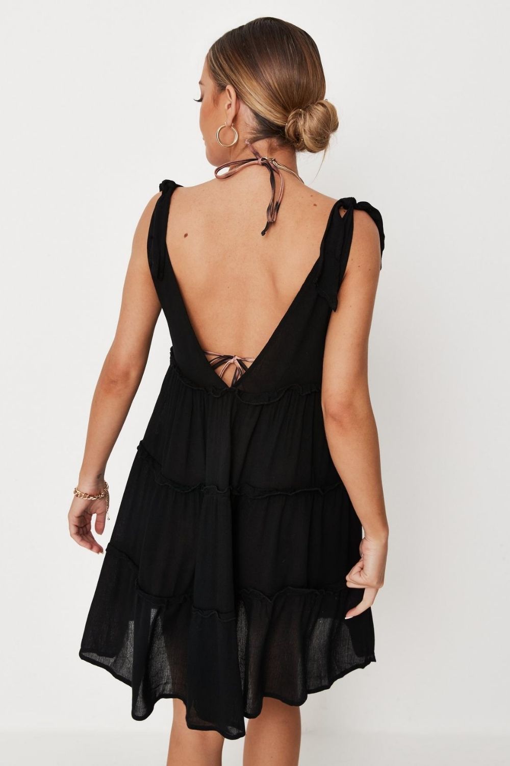 Embrace the warmth of summer in style with our Plunge Neck Ruffled Black Dress – a wardrobe essential that seamlessly blends fashion-forward design with comfort. Make a statement wherever you go, and let your confidence shine in this must have piece.