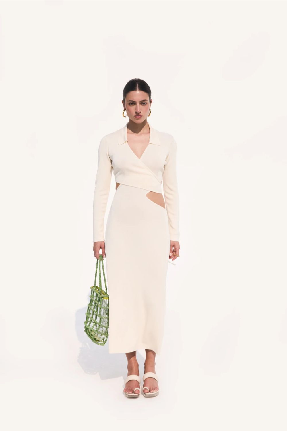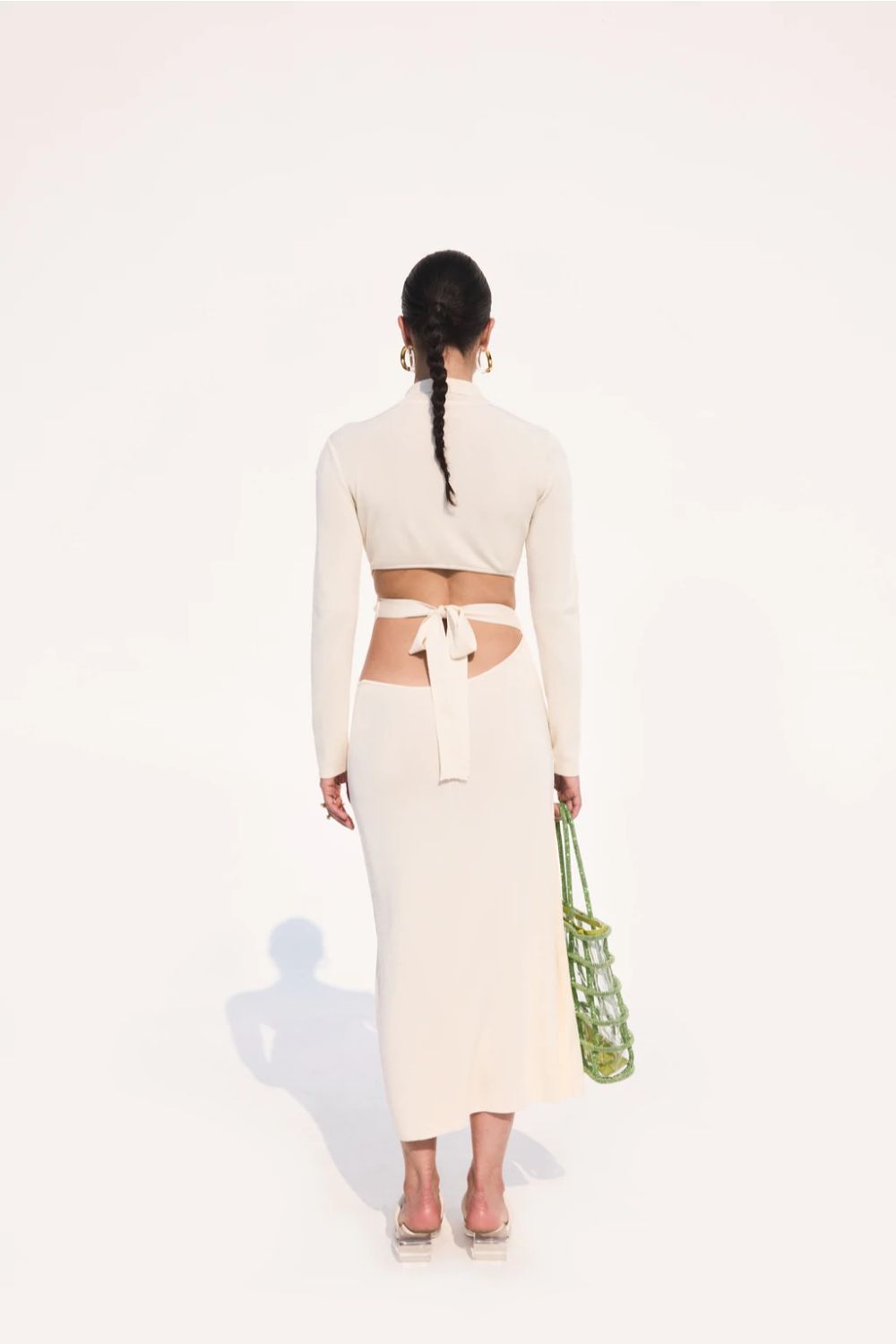 SKU:PolyWhiteVNeckCutOutMidiDress-XS