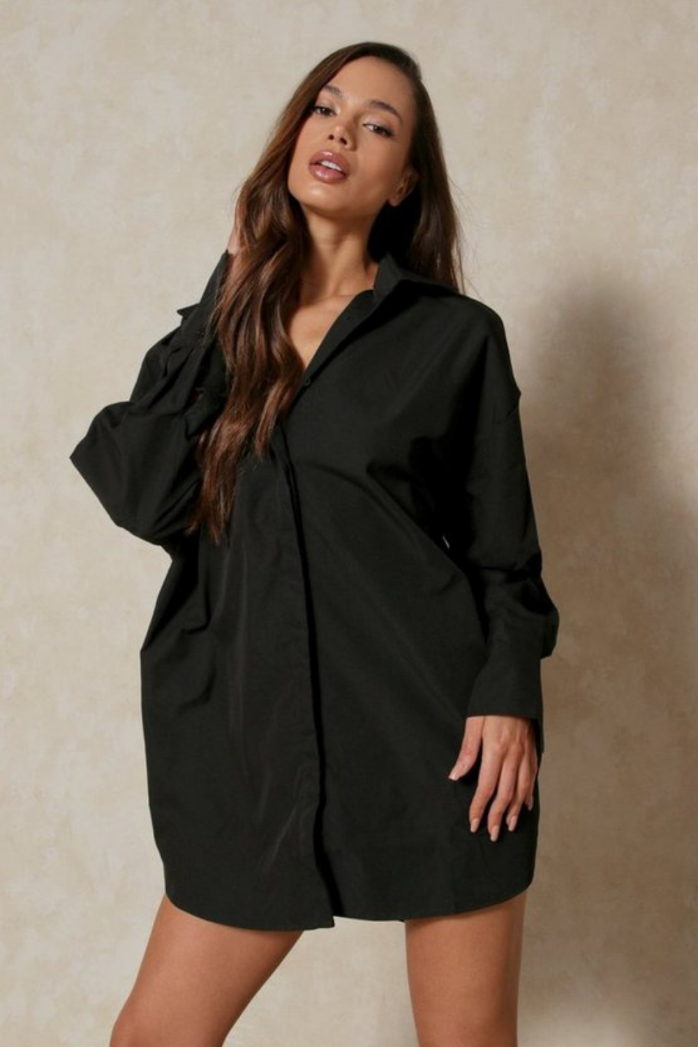 Introducing our Poplin Ruched Open Back Shirt Dress – the epitome of effortless chic and contemporary style. This versatile black dress is designed to make a statement with its unique features and comfortable fit. Let's dive into the details: