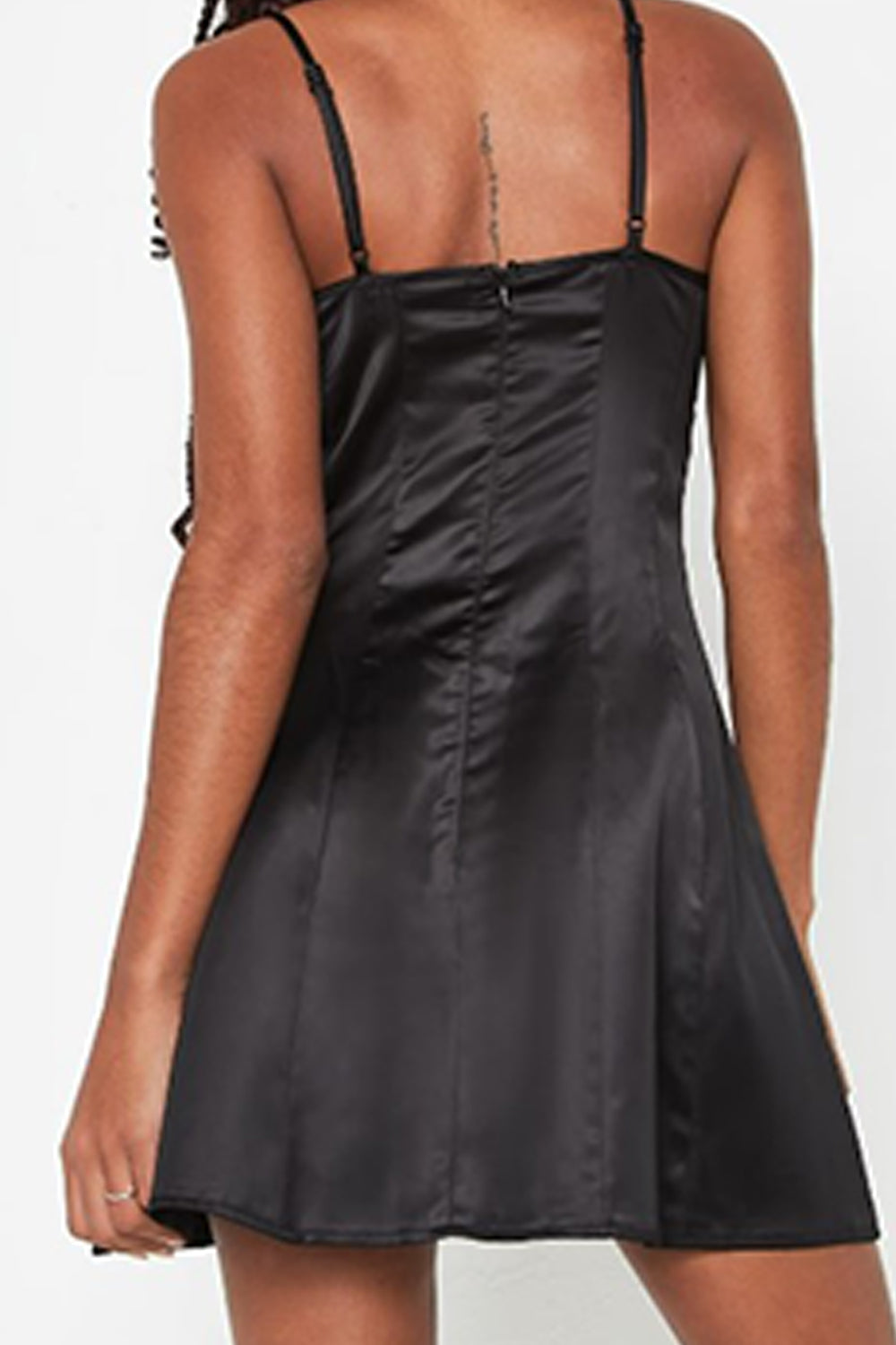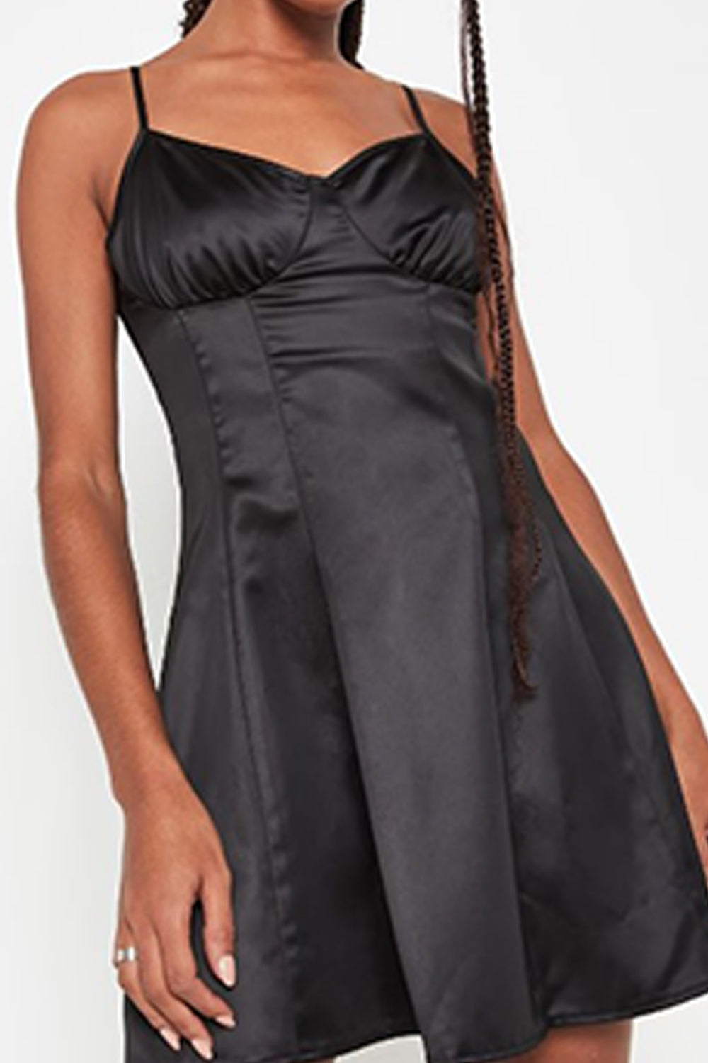 Type-Preveza Black Dress Color-Black Neck type-Sweetheart neck Sleeve Length-Sleeveless Fit-Slim Fabric-Satin