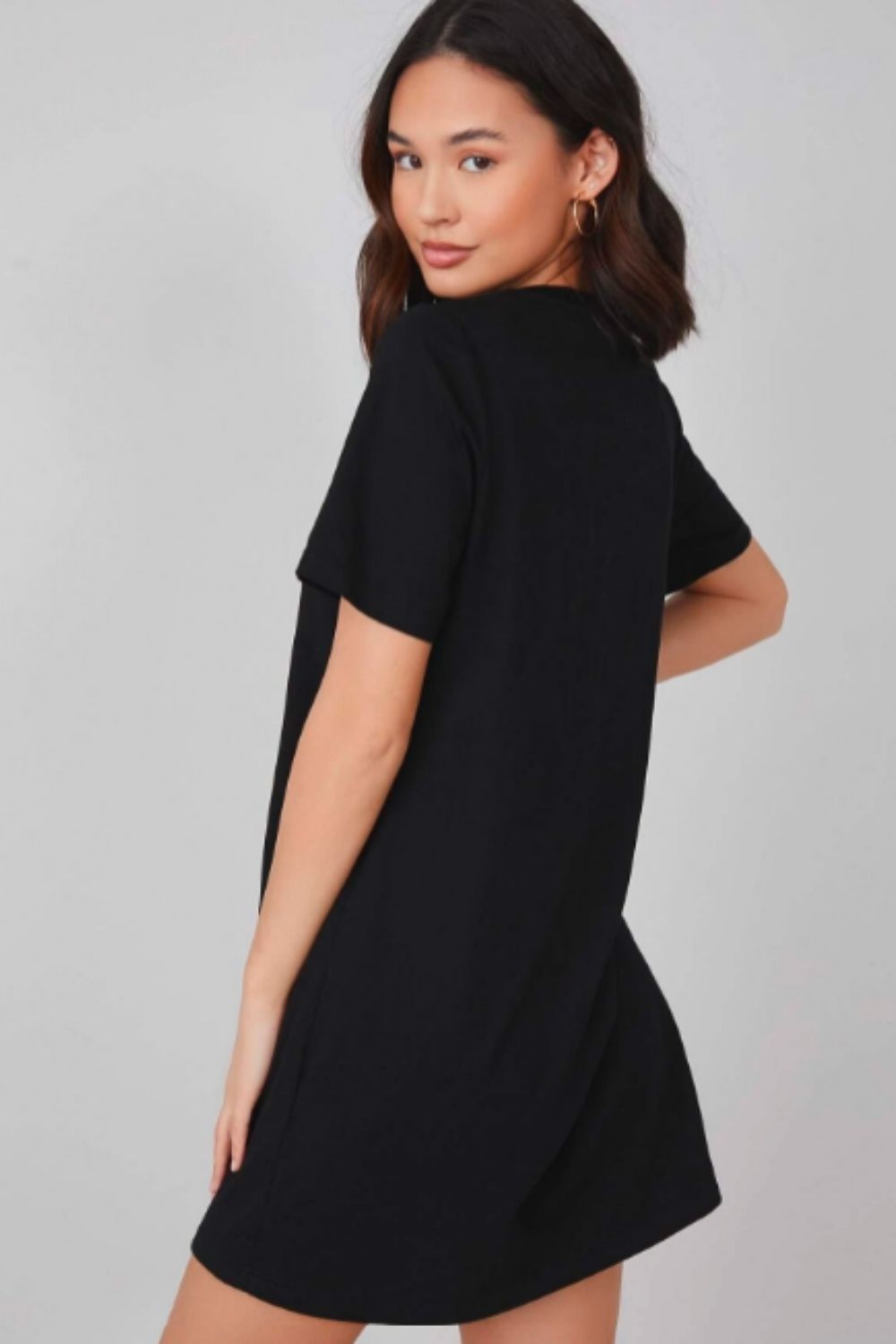 Product Description: Color: Black Neck Type: Round Neck Sleeve Length: Short Length: Mini Fit: Regular Season: Summer Fabric: Single Jersey Wash Care: Machine Wash