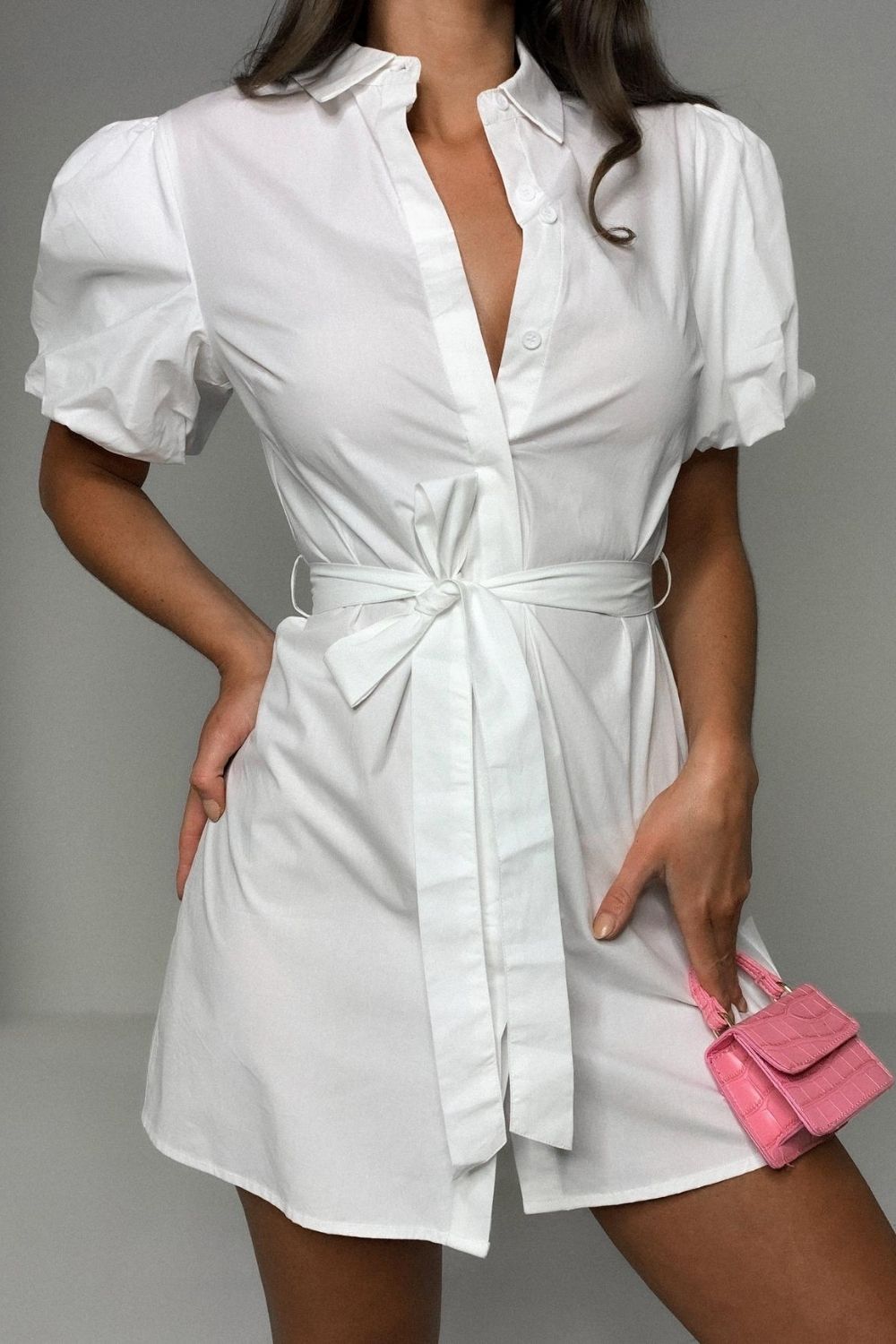 Introducing our Puff Sleeve Wrap Around Shirt Dress, a chic and versatile addition to your summer wardrobe. This dress effortlessly combines the sophistication of a classic collar with the playful charm of puff sleeves, creating a look that is both timeless and on-trend. The crisp white hue adds a touch of freshness, making it the perfect choice for those warm summer days and nights.