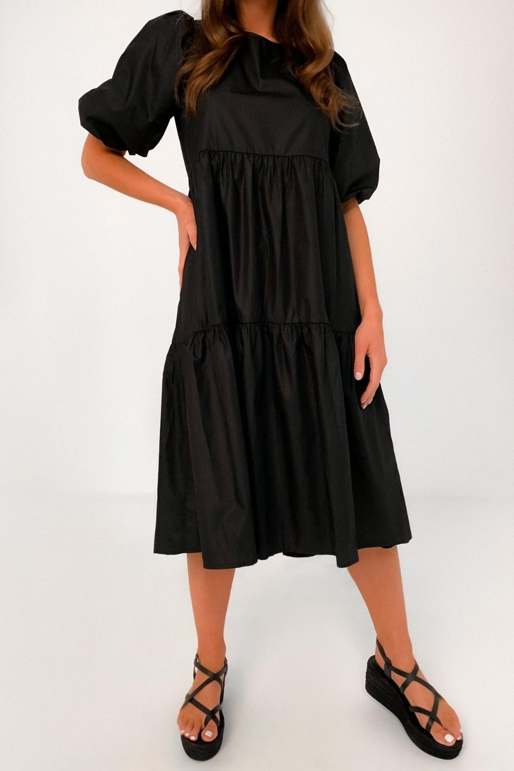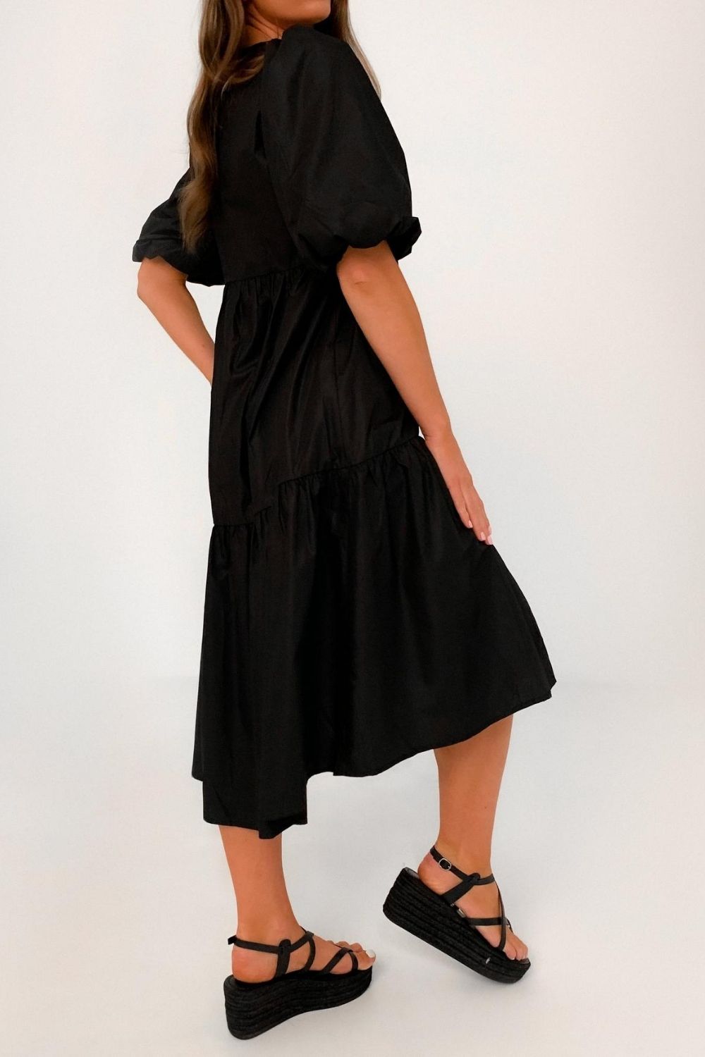 Type- Puff Sleeved Black Ruffle Midi Dress