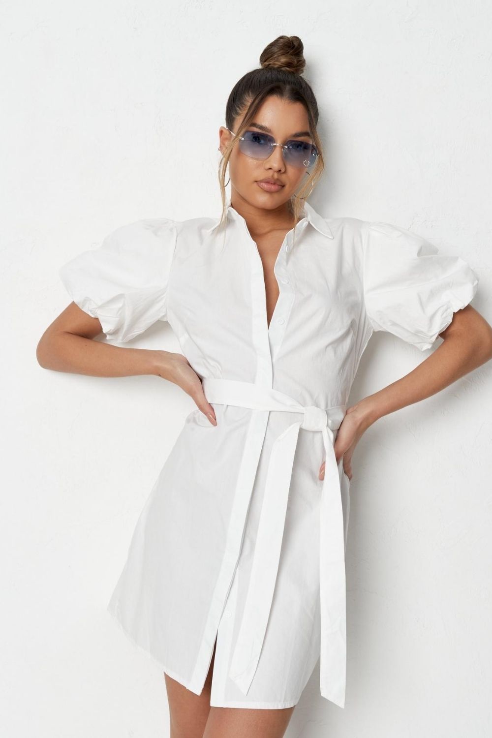 Effortless Elegance: Pair the Puff Sleeved Button Open Front White Shirt Dress with minimal accessories for an effortlessly chic look. Let the dress take center stage by adding simple hoop earrings and a delicate bracelet.