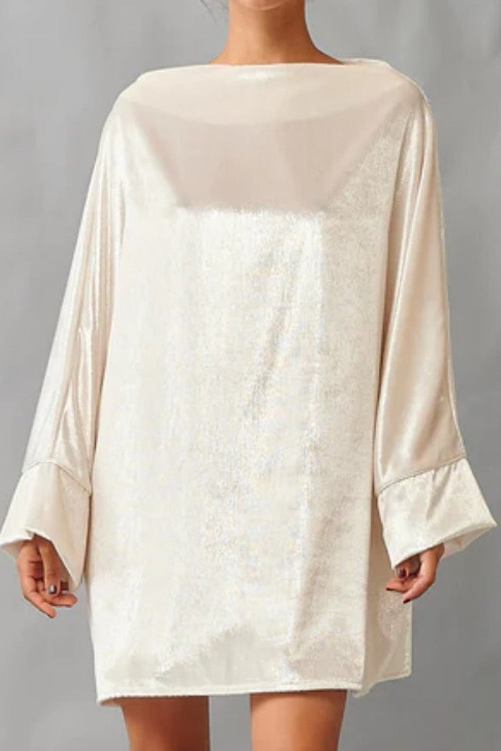 Type-Quintessential White Dress, Color-White, Neck type-Boat neck, Sleeve Length-Full sleeve, Fit-Relaxed, Fabric-Satin