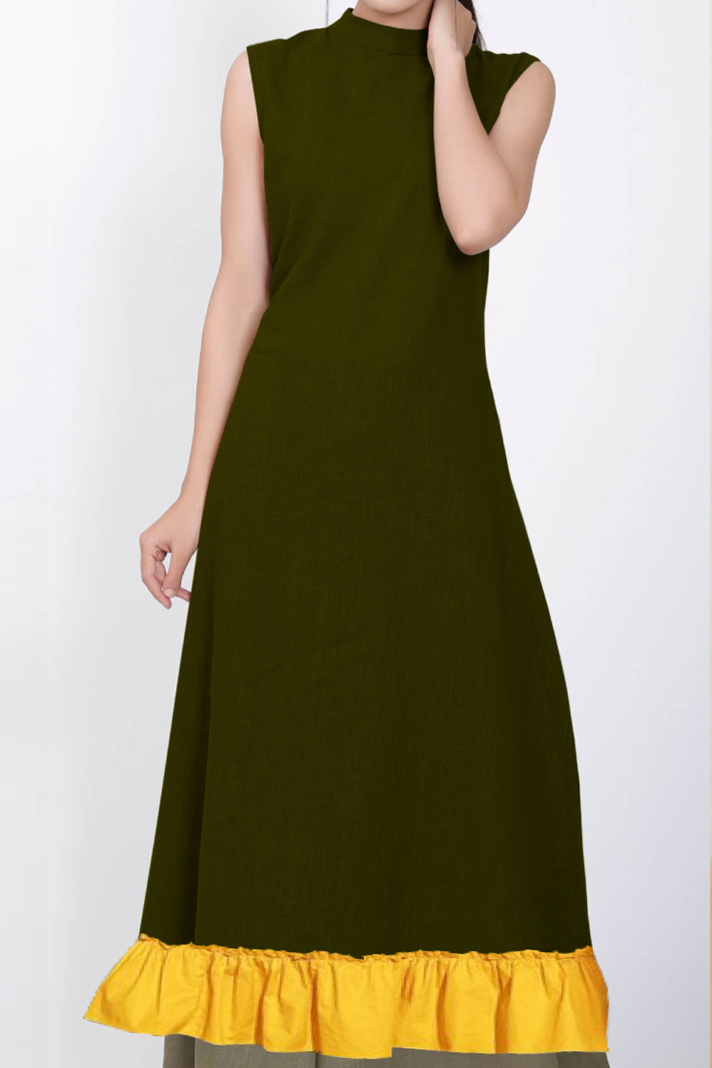Olive green kurta | Knee length | Ocre yellow ruffles on hem | Back opening | Sleeveless
