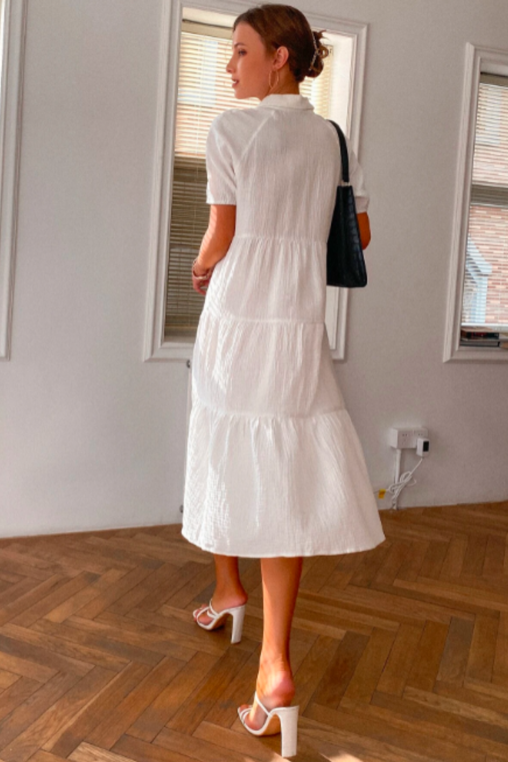 SKU:RaglanSleeveButtonDownTieredMidiDress-XS