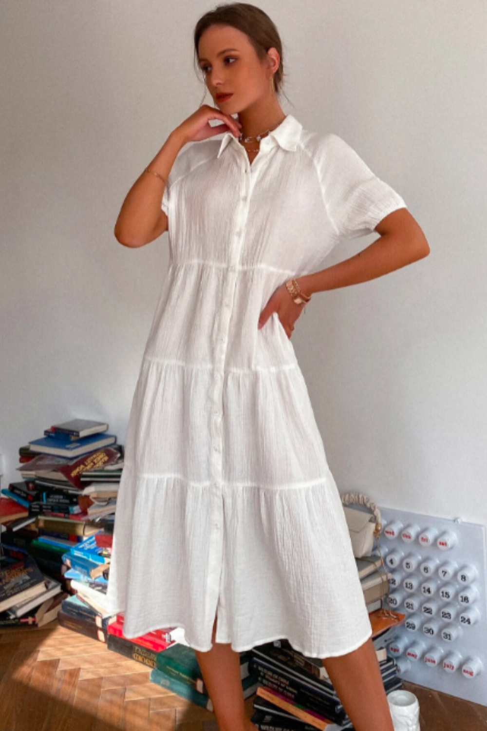 - Type: Raglan Sleeve Button Down Tiered Midi Dress