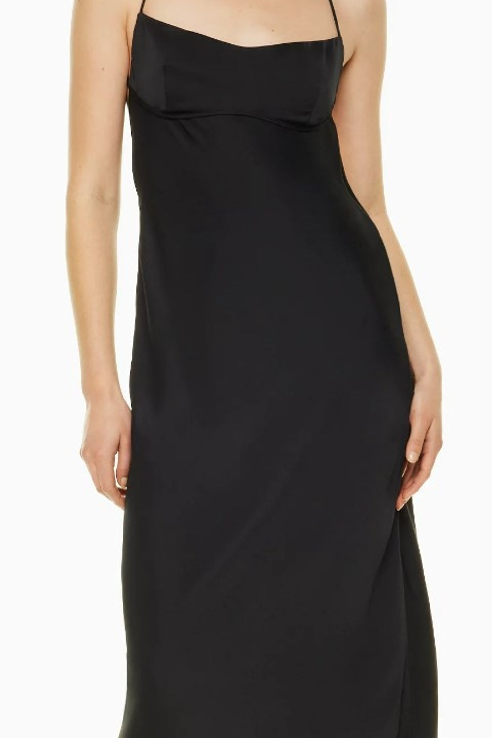 Type - Rapturous Black Dress, Color - Black, Neck type - Straight neck, Sleeve Length - Sleeveless, Fit - Body Fit, Fabric - Satin Lycra