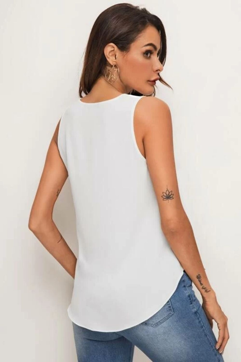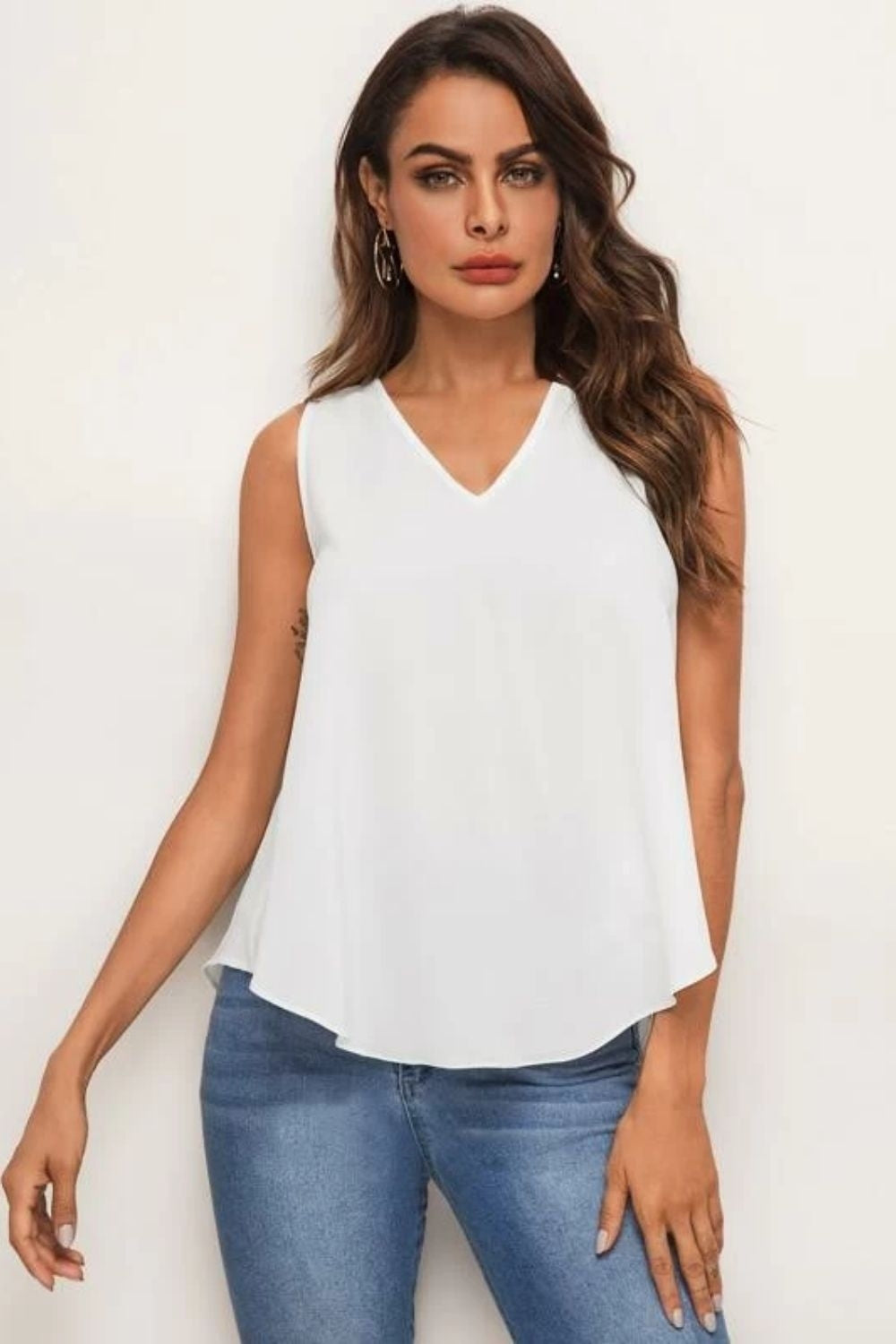 Product Description: The Reasons White Sleeveless Top is a versatile wardrobe essential that seamlessly transitions from day to night. The crisp white color adds a touch of freshness to your summer ensemble, making it a perfect canvas for accessorizing. The V-neckline adds a hint of femininity, while the sleeveless design allows you to soak up the sun while staying on-trend.