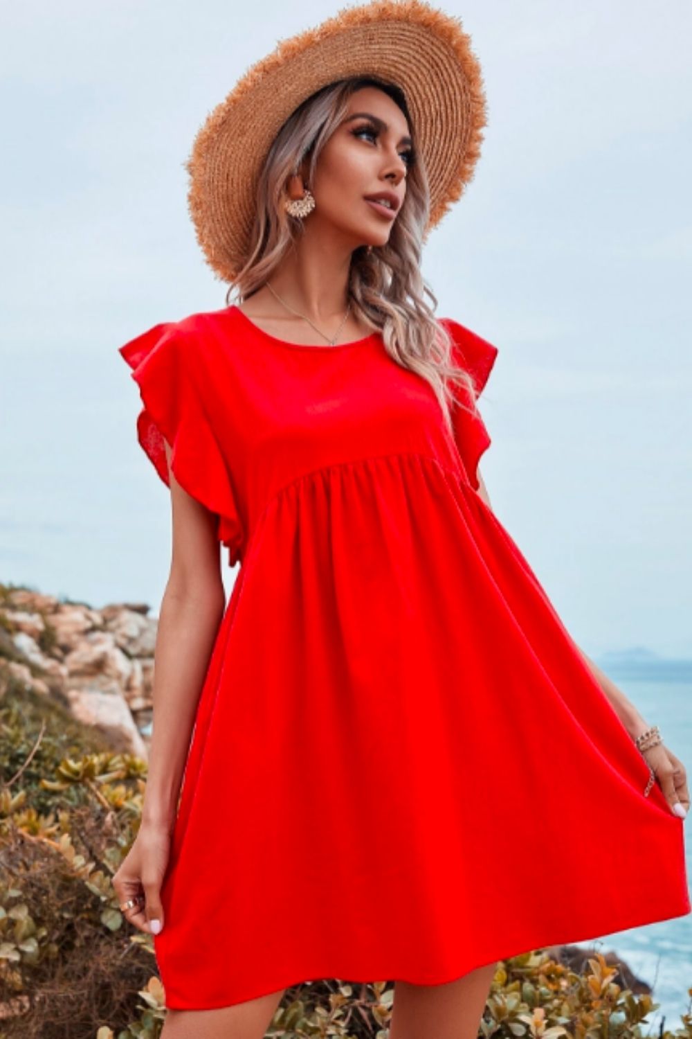 SKU:RedSolidRuffleCuffSmockDress-XS