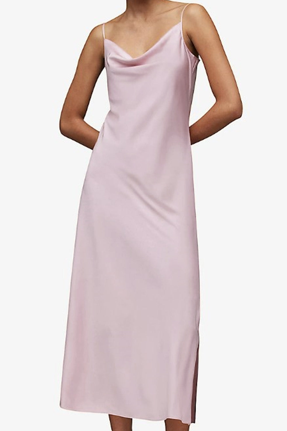 Type-Resplendent Pink Dress, Color-Pink, Neck type-Cowl neck, Sleeve Length-Sleeveless, Fit-Body Fit, Fabric-Satin