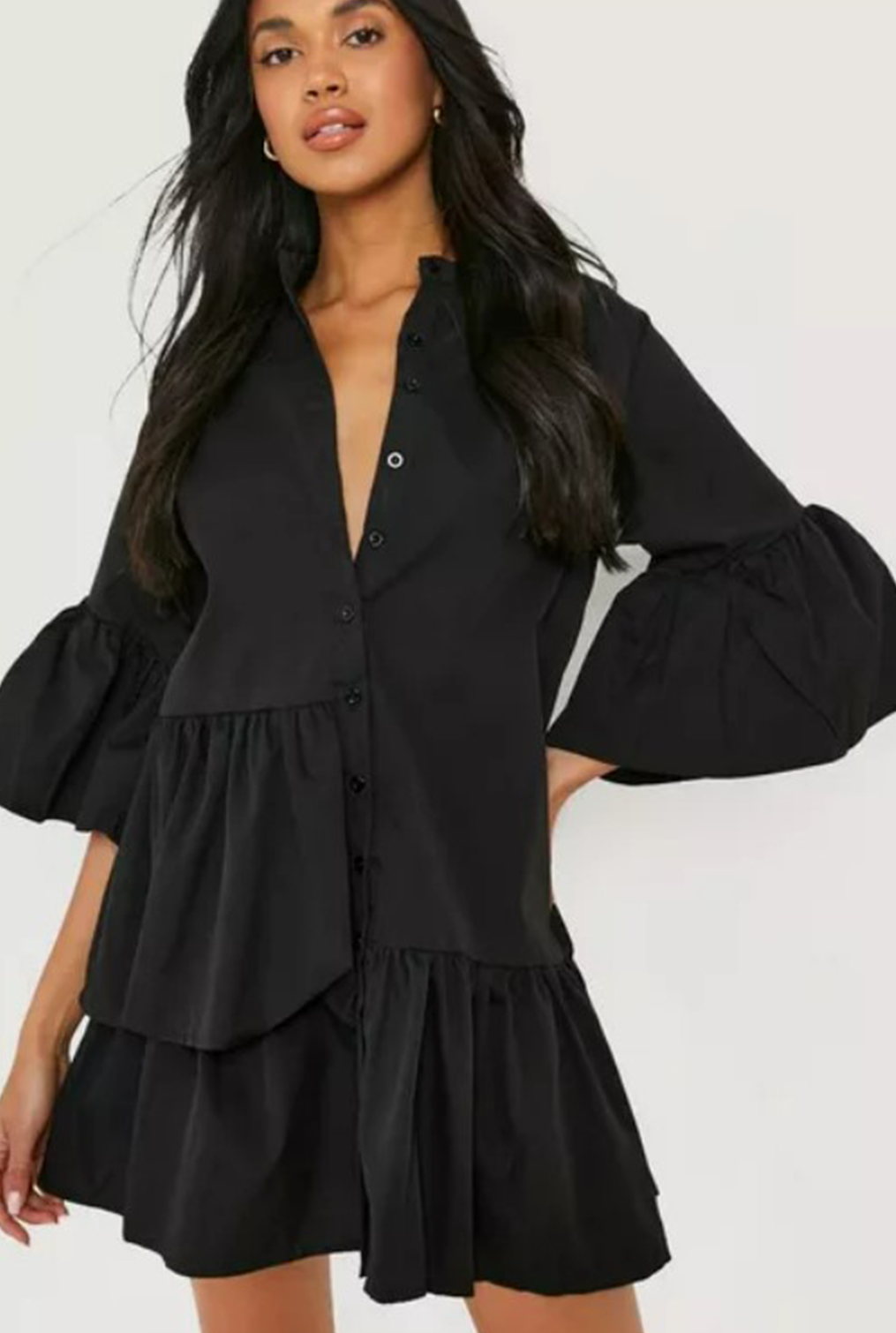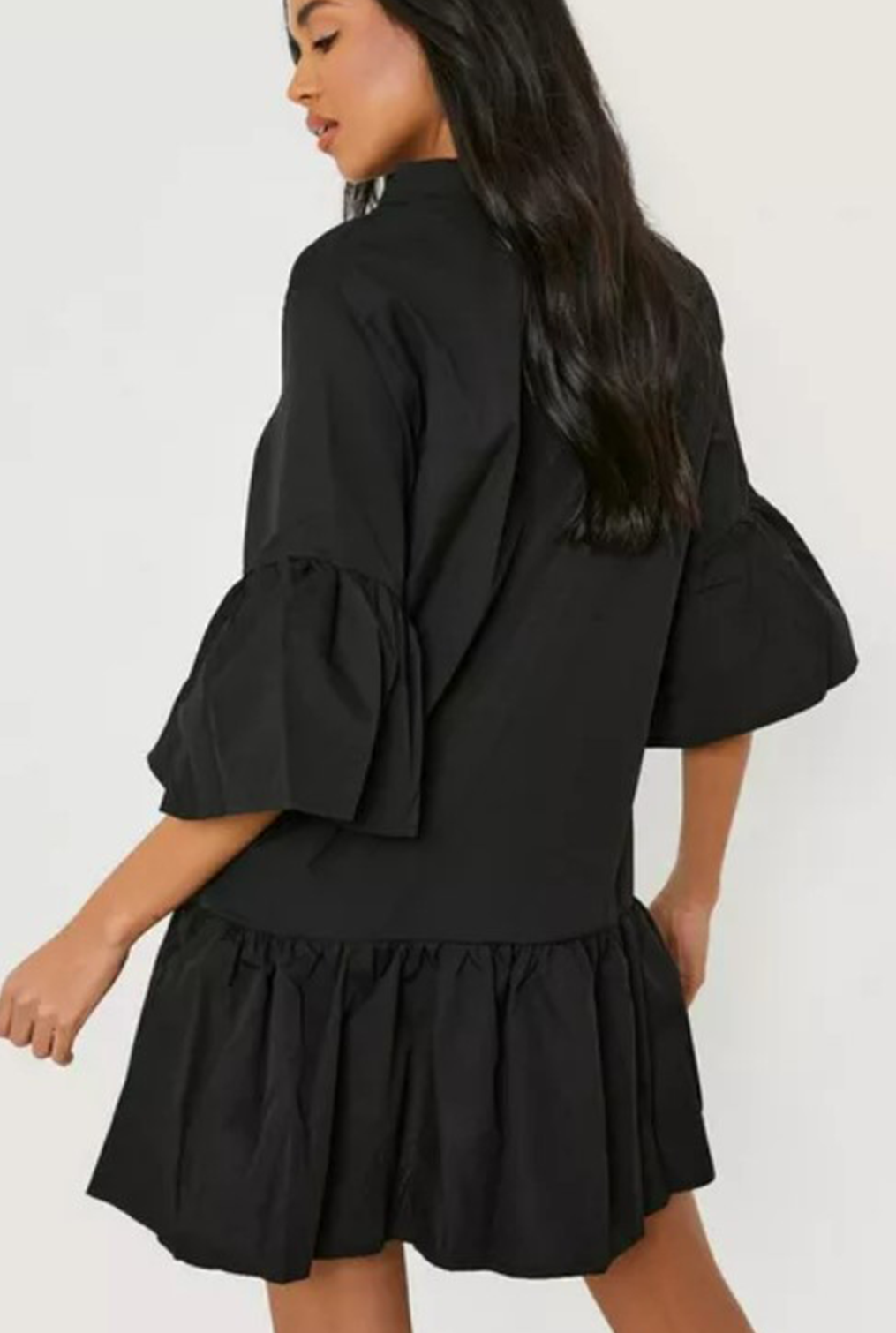 Type-Romp Black Dress, Color-Black, Neck type-Collar neck, Sleeve Length-Below elbow length, Fit-Regular, Fabric-Poplin