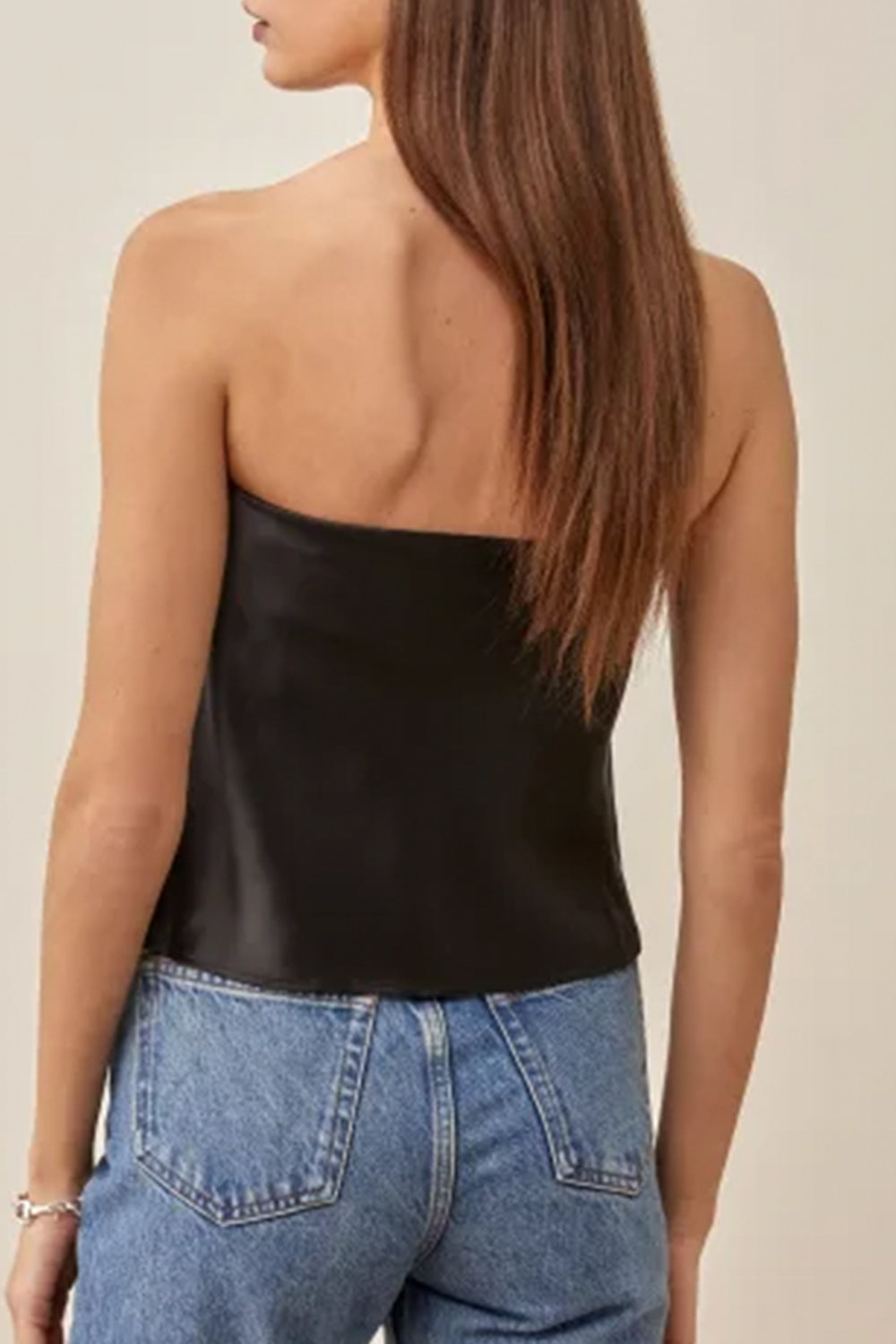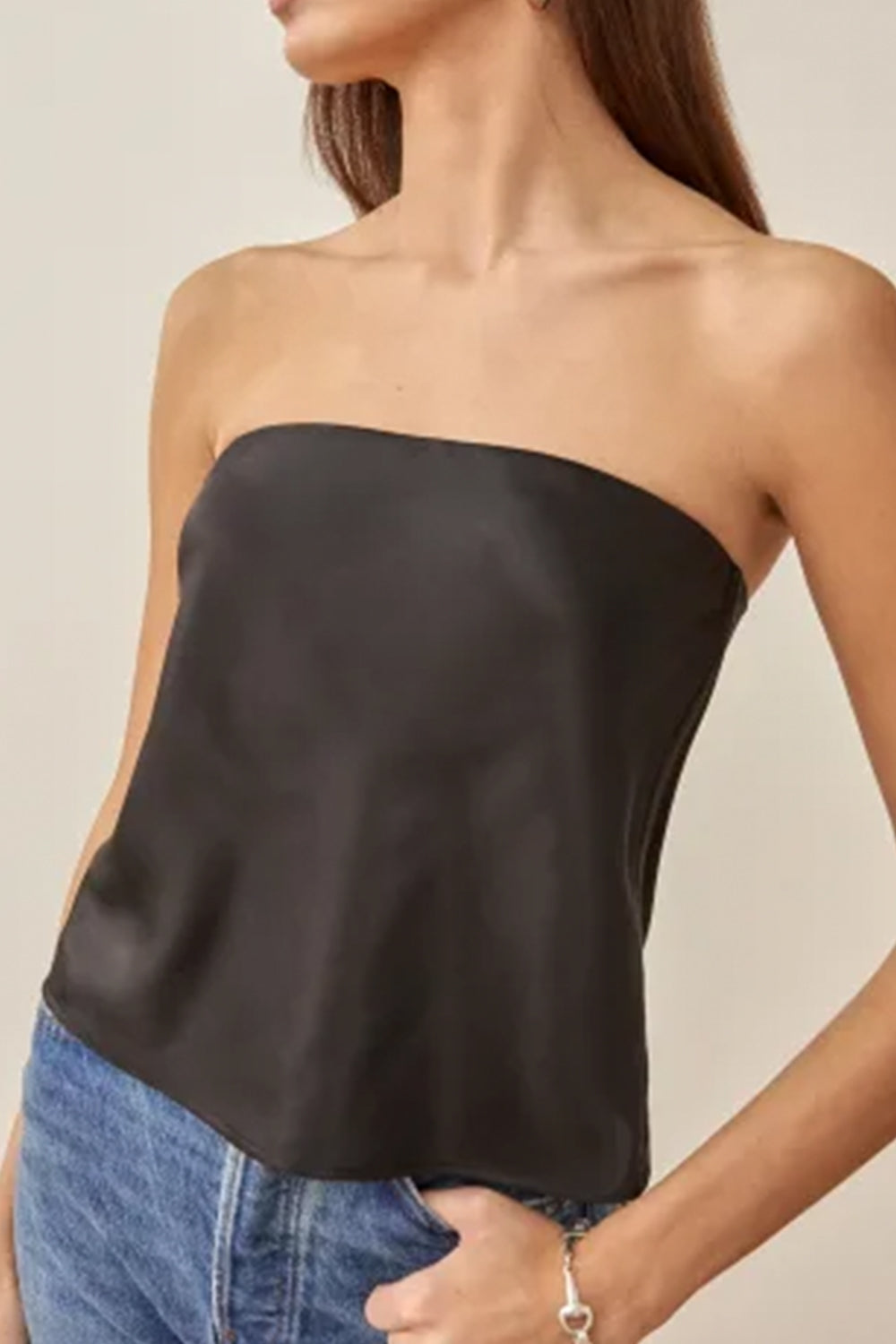 Type-Rotherhithe Black Top Color-Black Neck type-Straight neckline Sleeve Length-Sleeveless Fit-Body Fit Fabric-Satin