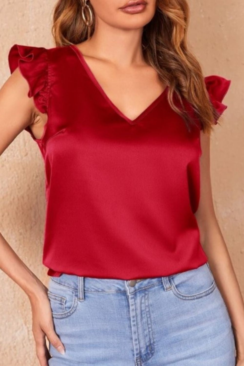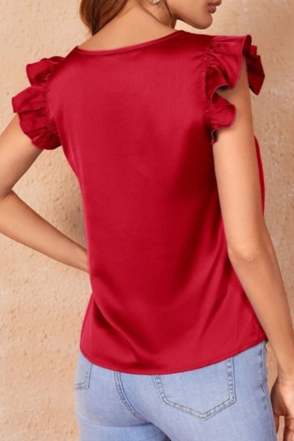 Featuring a flattering V neckline, this top accentuates your neckline with elegance, while the sleeveless design ensures optimal comfort, making it a perfect choice for those warm summer days. The highlight of this top lies in its exquisite ruffle sleeves, adding a touch of whimsy and flair to your ensemble.