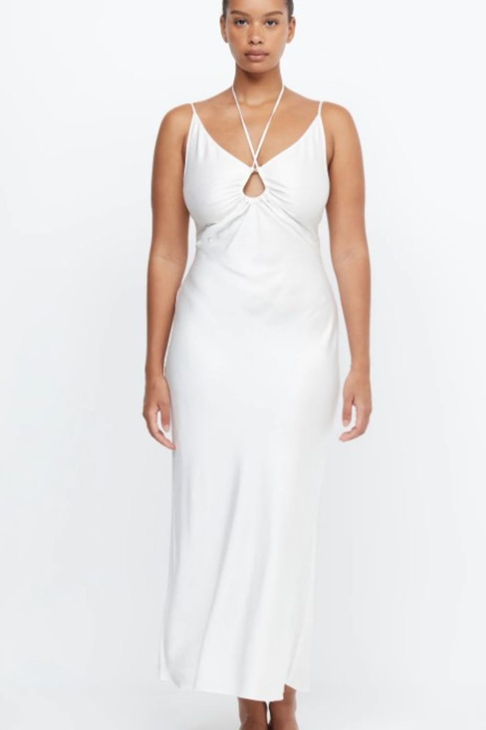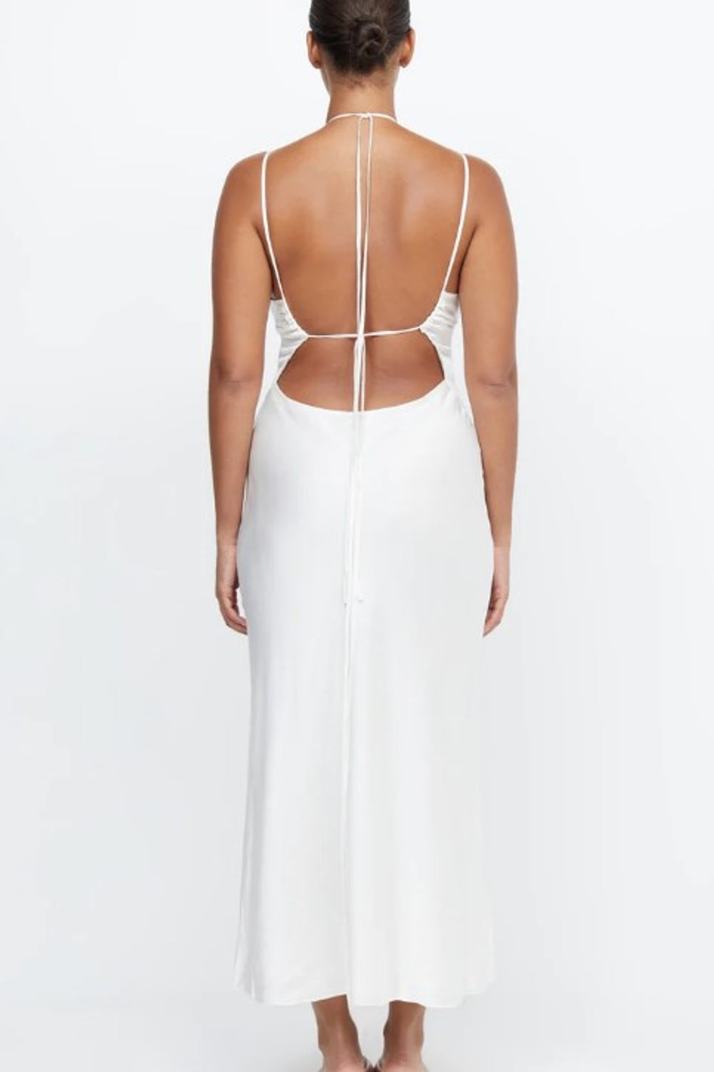 Type-Saguenay White Dress, Color-White, Neck type-Crossover Halter Neck, Sleeve Length-Sleeveless, Fit-Body Fit, Fabric-Satin Lycra