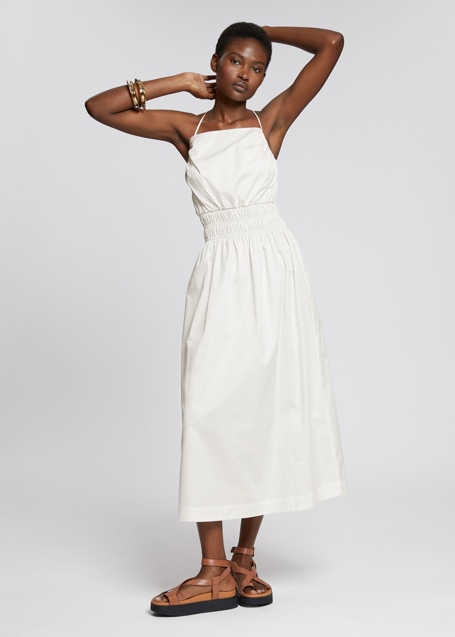 Type-Saratov White Dress Color-Off White Neck type-Straight neckline Sleeve Length-Sleeveless Fit-Slim Fabric-Poplin