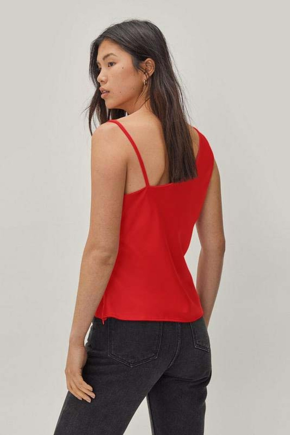 Crafted from luxurious satin fabric, this cami top drapes effortlessly, creating a flattering silhouette. The sleeveless design and regular fit ensure comfort, while the asymmetric hemline adds a modern and chic element to your ensemble. The vibrant red color makes a bold statement, making it a standout piece in your collection.