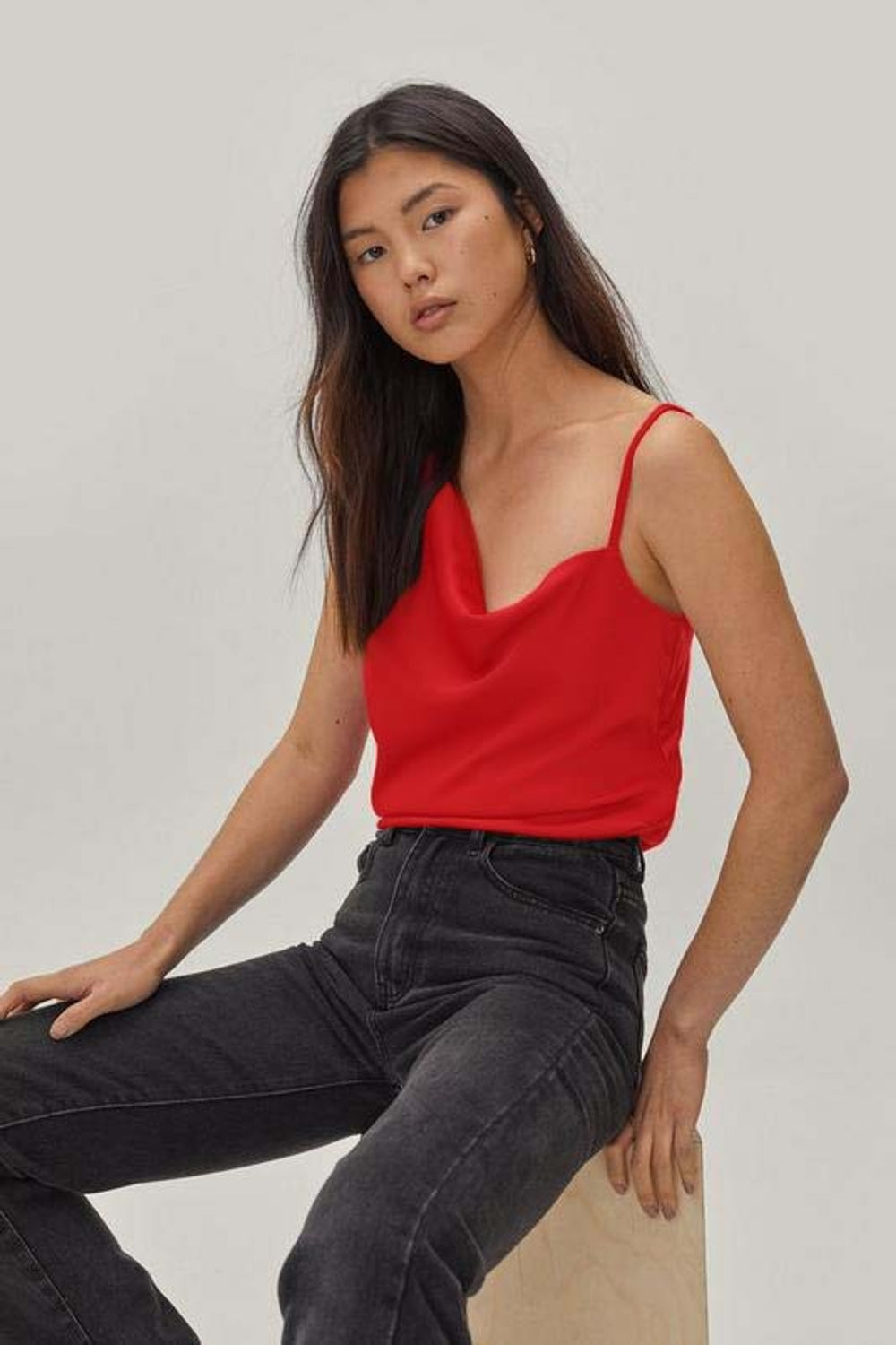 With its bold color, luxurious fabric, and versatile design, the Satin Asymmetric Cowl Neck Cami Top is a wardrobe staple that will effortlessly take you from day to night with a touch of glamour and sophistication.