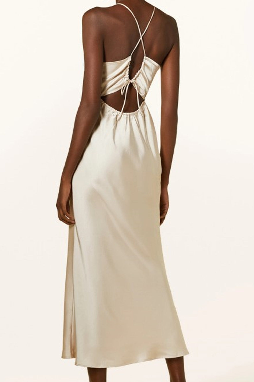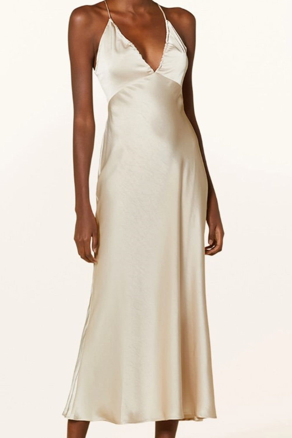 Type-Savannah Off-White Dress, Color-Off-White, Neck type-Deep V neck, Sleeve Length-Sleeveless, Fit-Body Fit, Fabric-Satin Lycra
