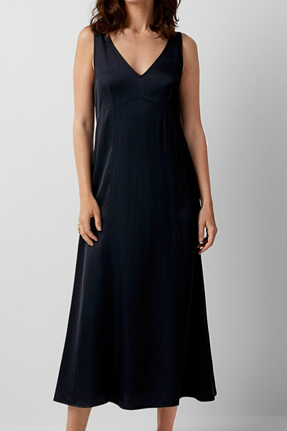 Type-Serene Black Dress, Color-Black, Neck type-V Neckline, Sleeve Length-Sleeveless, Fit-Regular, Fabric-Satin Lycra