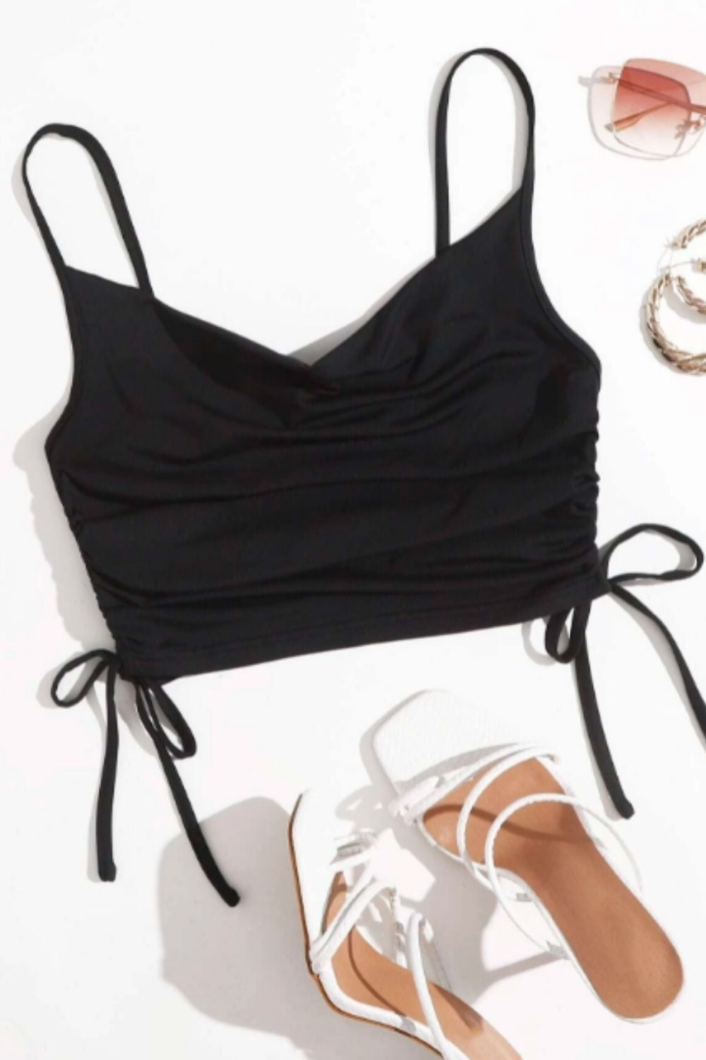 Elevate your summer wardrobe with our Side Seam Ruched Cami Top in timeless black. This sleeveless cami top is designed with a flattering round neck and a body-hugging fit that accentuates your curves. The unique side seam ruching adds a touch of sophistication and a playful flair, making it a versatile piece for various occasions.