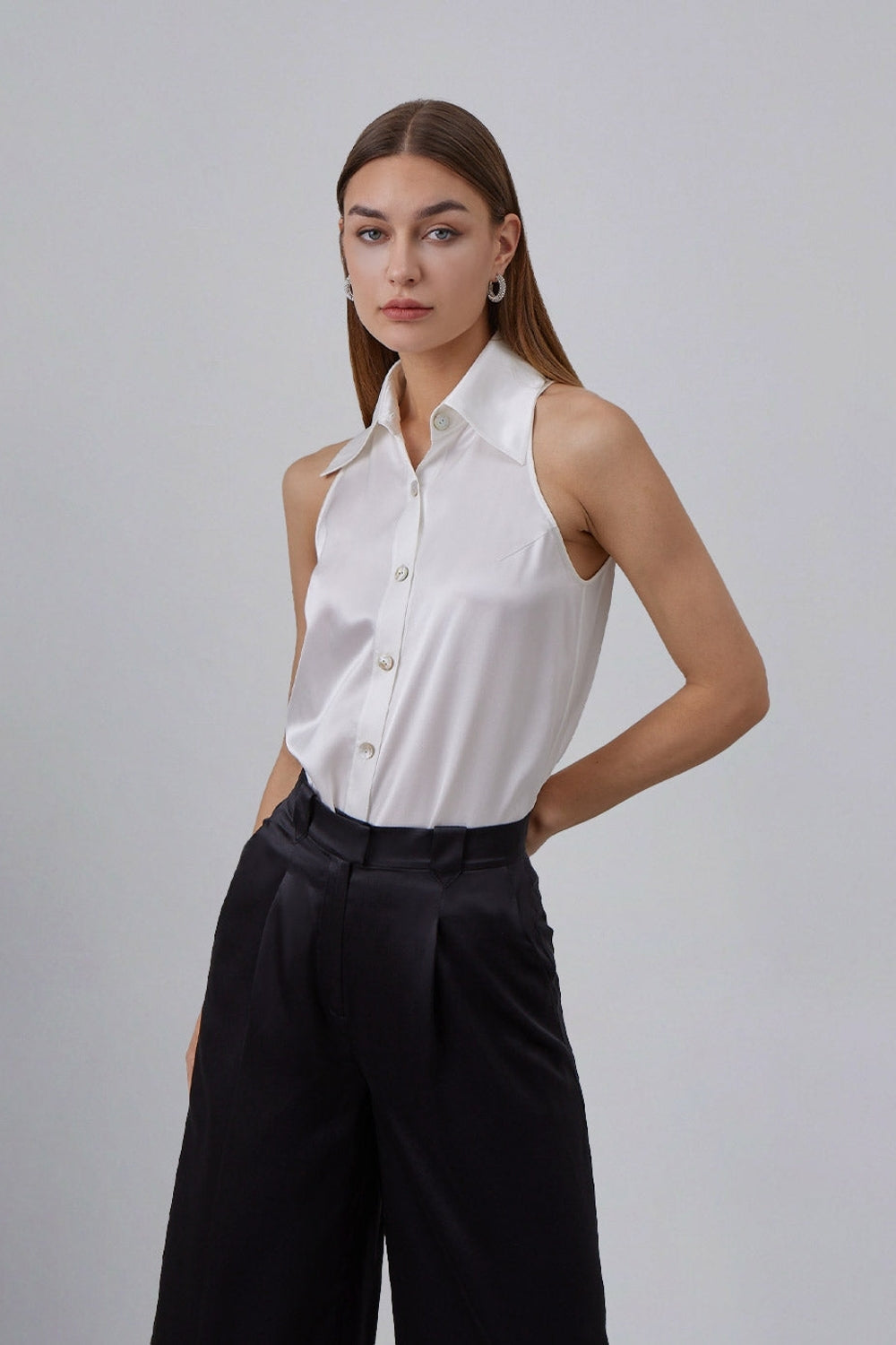 Whether you're attending a summer soirée or simply enjoying a leisurely day out, our Sleeveless Silky Blouse With Exaggerated Collar Top promises to elevate your look with its understated elegance and timeless appeal.