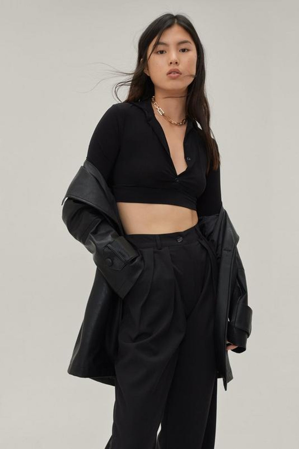 High-Waisted Bottoms: Opt for high-waisted jeans, trousers, or skirts to complement the cropped length of the top. This styling choice accentuates your waistline and elongates your silhouette.