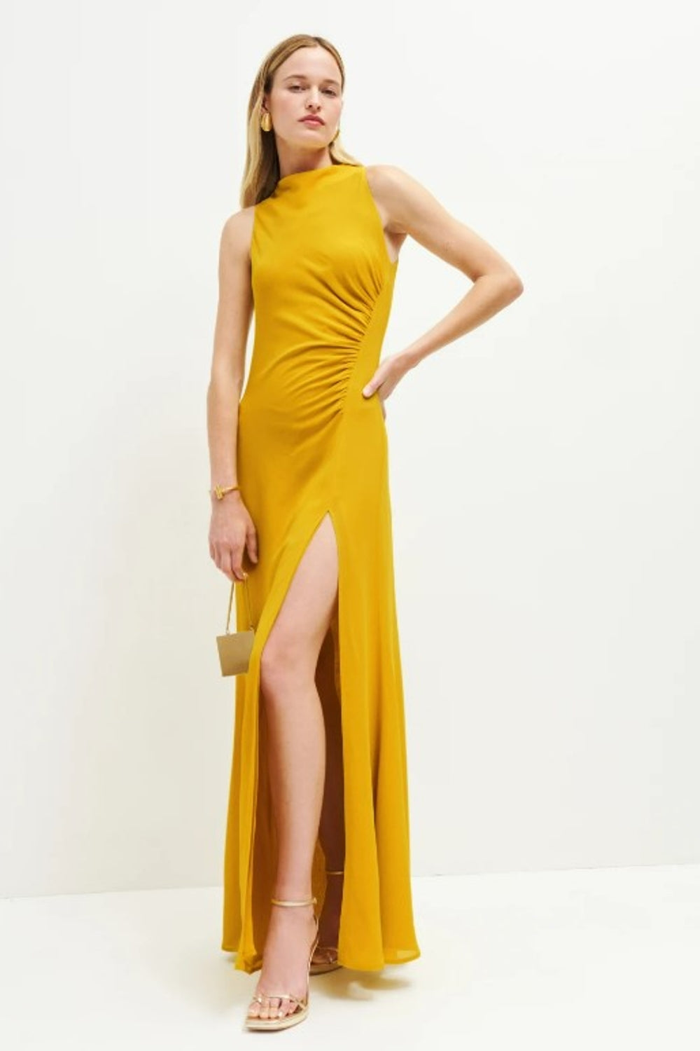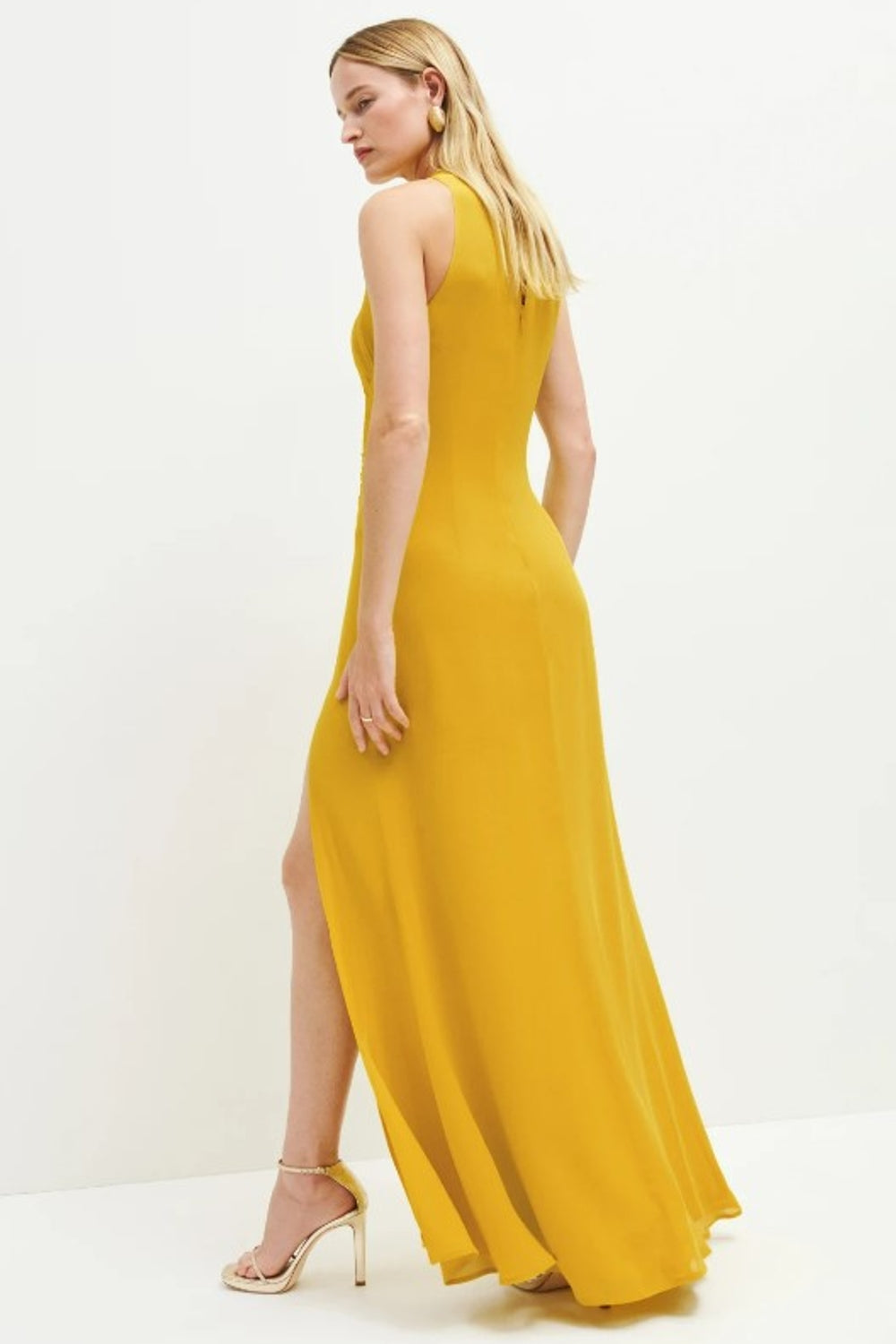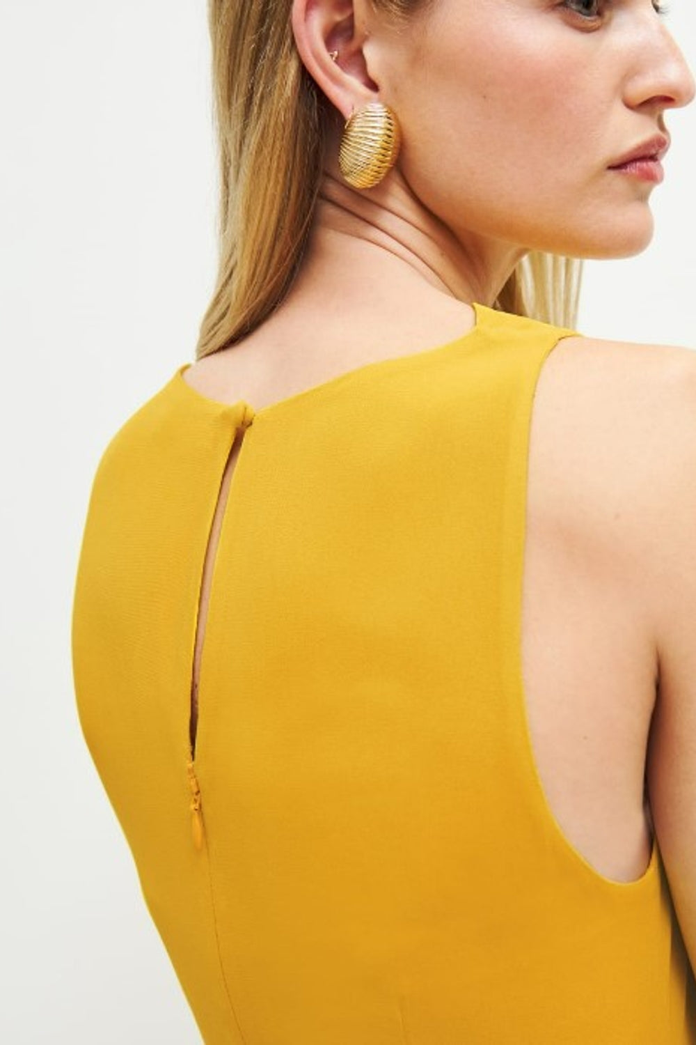 Type-Smolensk Yellow Dress, Color-Yellow, Neck type-Close neckline, Sleeve Length-Sleeveless, Fit-Slim, Fabric-Rayon