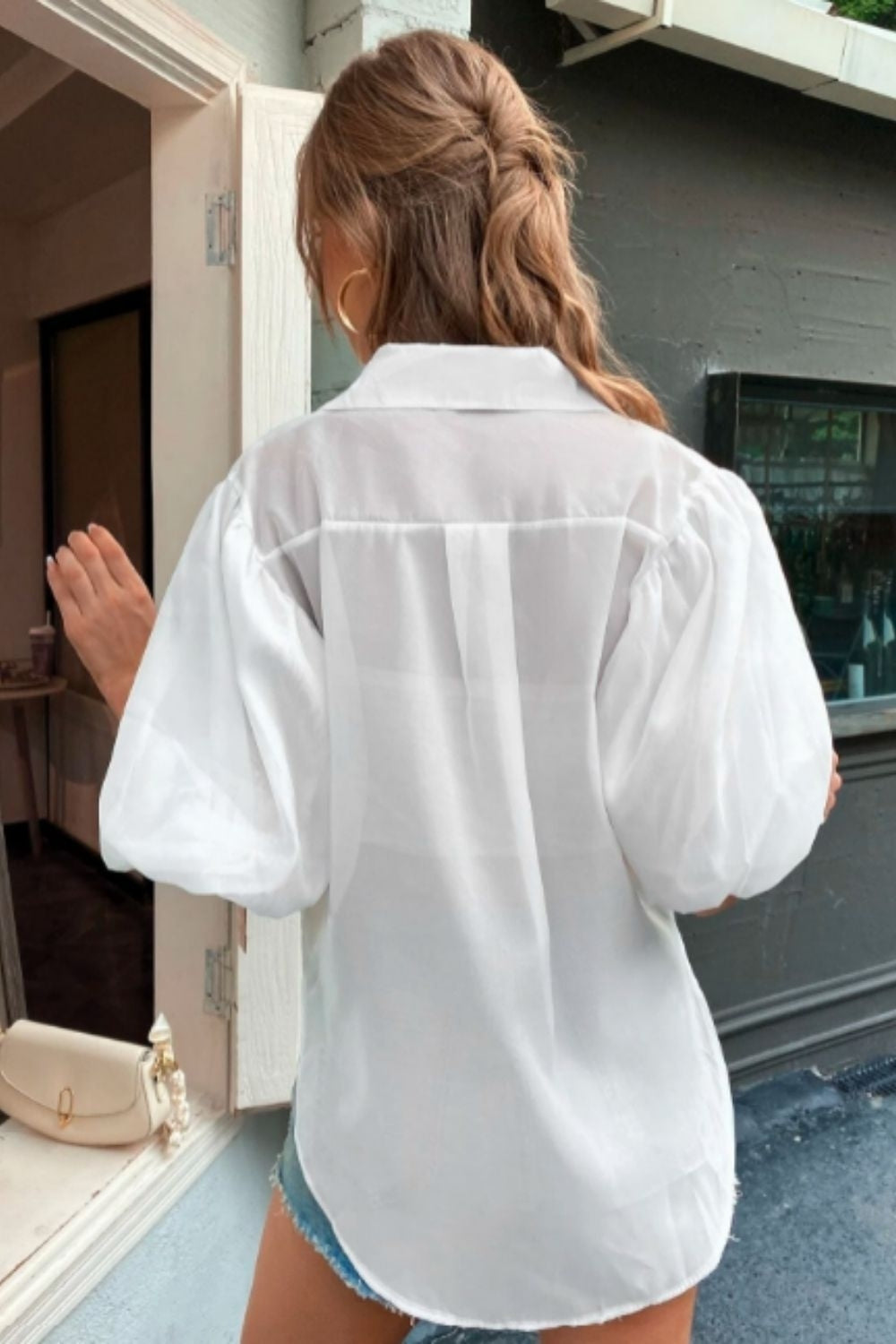 SKU:SolidButtonThroughBishopSleeveBlouse-XS