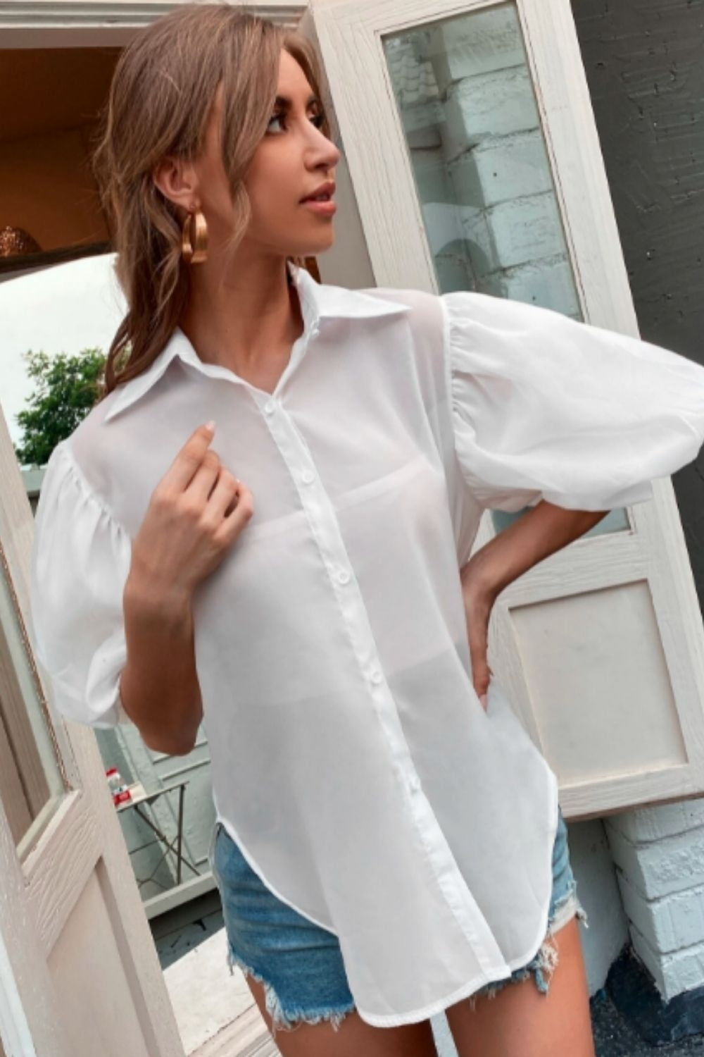Type- Solid Button Through Bishop Sleeve Blouse